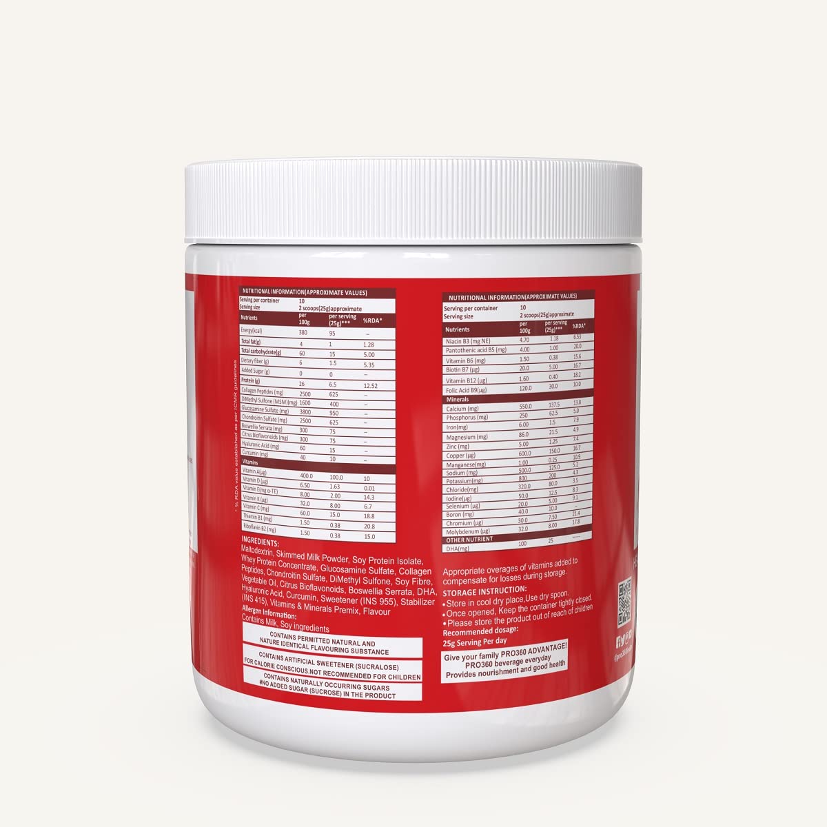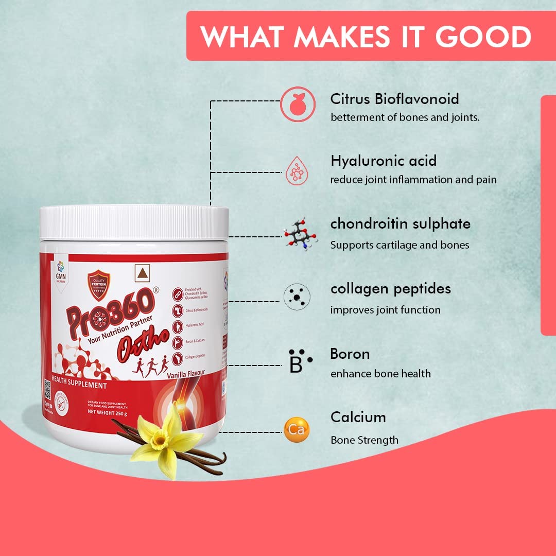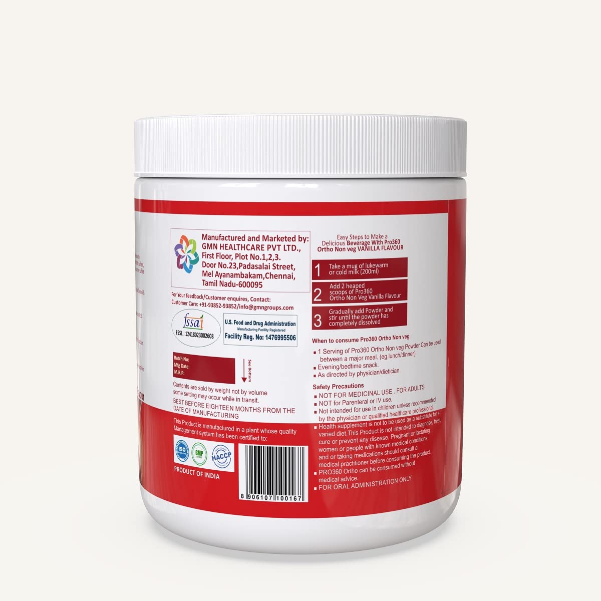 Pro360 Ortho nonveg contains collagen peptides glucosamine sulfate chondroitin sulfate. Pro360 Ortho nonveg is loaded with MSM. Pro360 ortho nonveg is also rich in boswellia serrata. Endowed with dha omega 3 (triple strength). It comes in no added sugar formula.