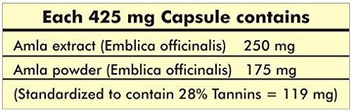 Each capsule contains amla extract 250mg amla powder 175mg excipients: silicon dioxide gelatin capsule. All our products are made from quality items. We recommend that you read labels warnings and directions of all products before use and not rely solely on the information. Care instruction keep away from the items or products which may cause damage to this product.