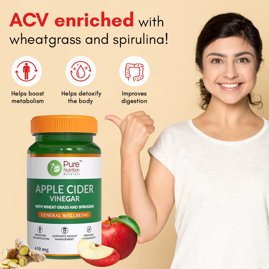 Pure Nutrition Apple Cider Vinegar with Wheat Grass & Spirulina for Enhanced Wellness | Rich in Antioxidants | Supports Weight Management Detoxification & Immunity - 60 Veg Capsules