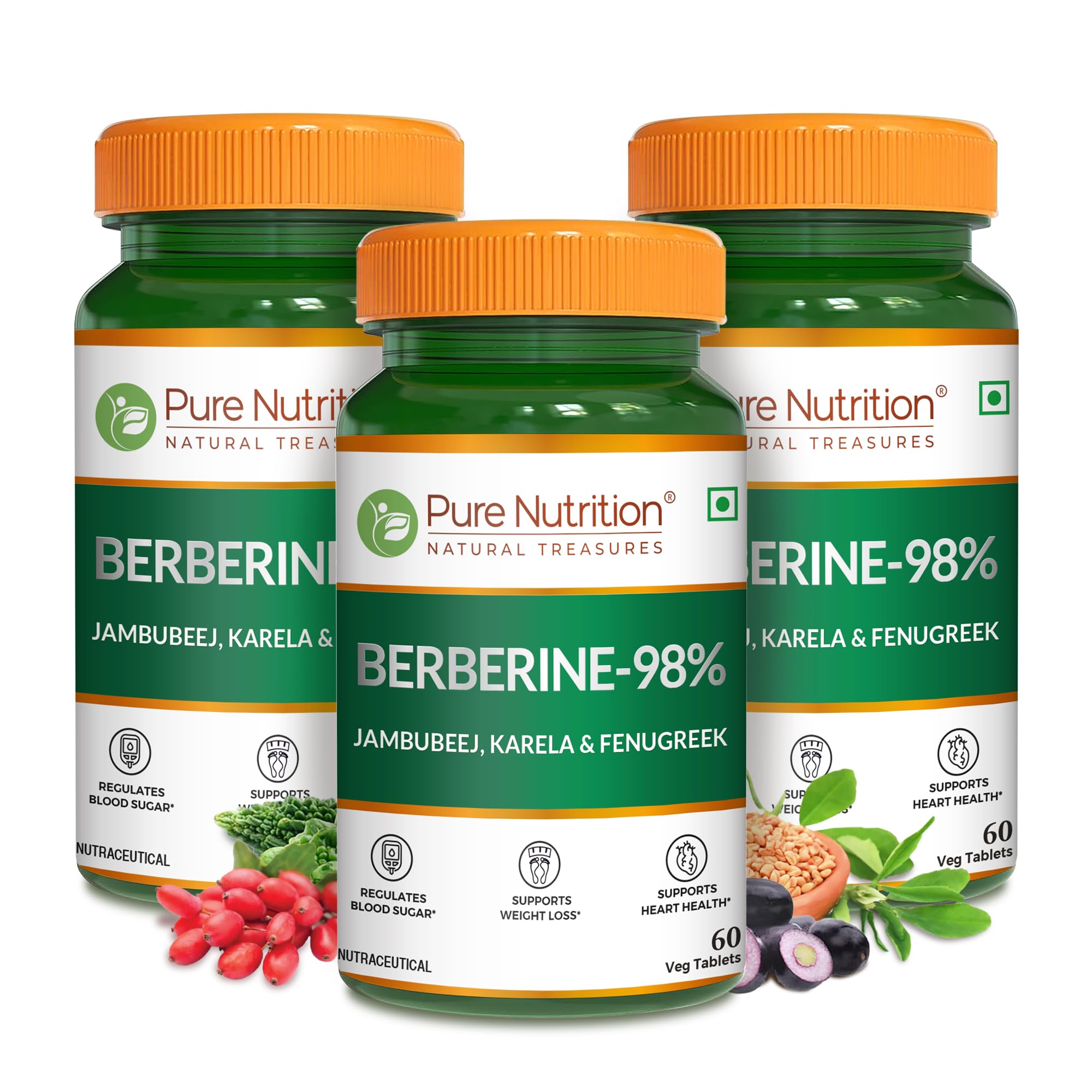 Pure Nutrition BERBERINE 98% supplement integrates high-potency berberine extract with Jamun Karela and Fenugreek extracts. This blend is crafted to help in weight management by supporting metabolism. Additionally the supplement promotes heart health with berberine recognized for its cardiovascular benefits. Each vegetarian tablet ensures convenience and quality offering a holistic approach to wellness through natural ingredients known for their beneficial properties.