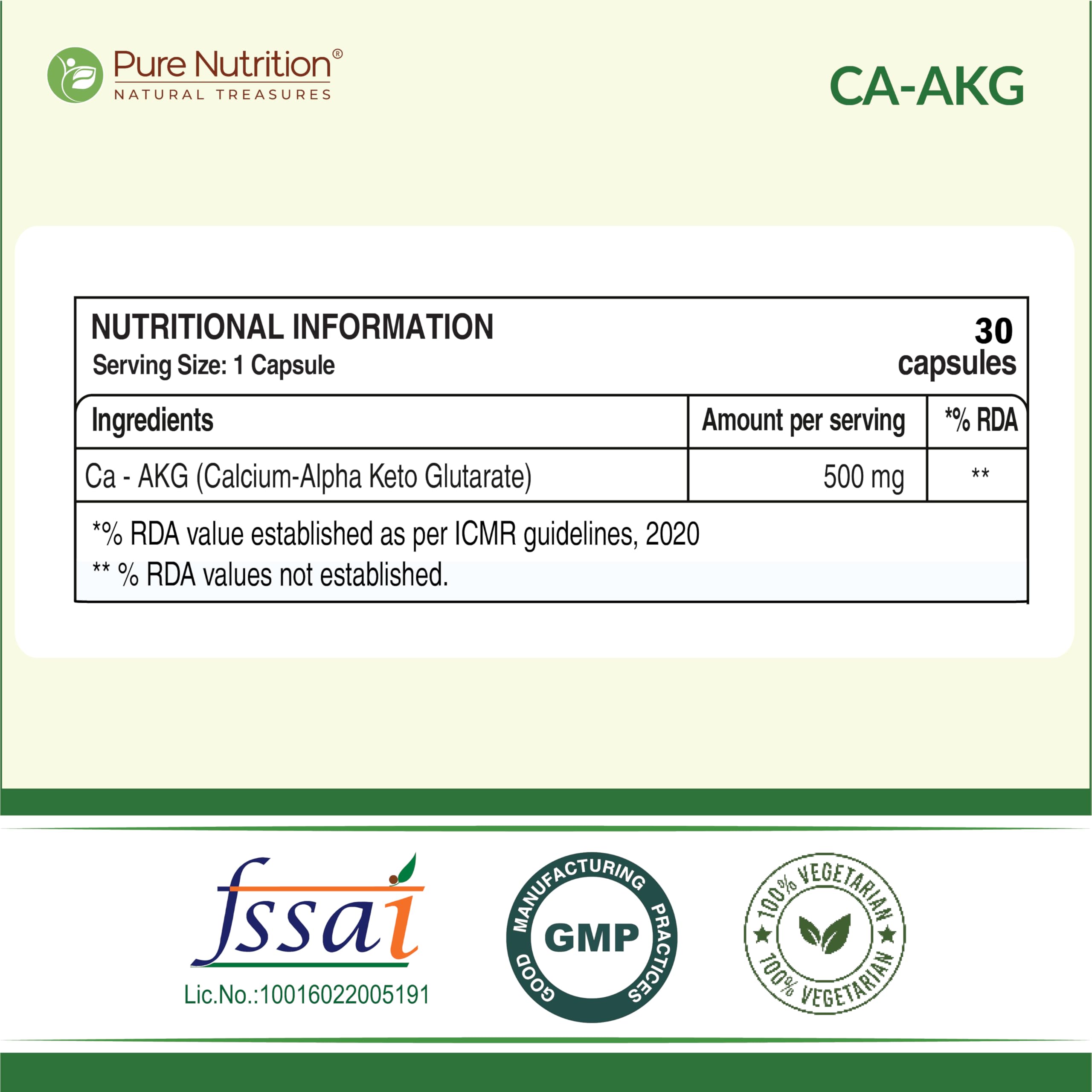 Pure Nutrition Ca-AKG (Calcium Alpha-Ketoglutarate) is a scientifically formulated supplement designed to support healthy aging cellular energy and metabolic function. Each 500mg veg capsule combines calcium with alpha-ketoglutarate to help maintain joint comfort support muscle recovery and promote overall vitality. Ideal for athletes active individuals and those seeking healthy longevity support. Made with high-quality plant-based ingredients and free from artificial additives. Suitable for men and women following a vegetarian lifestyle.