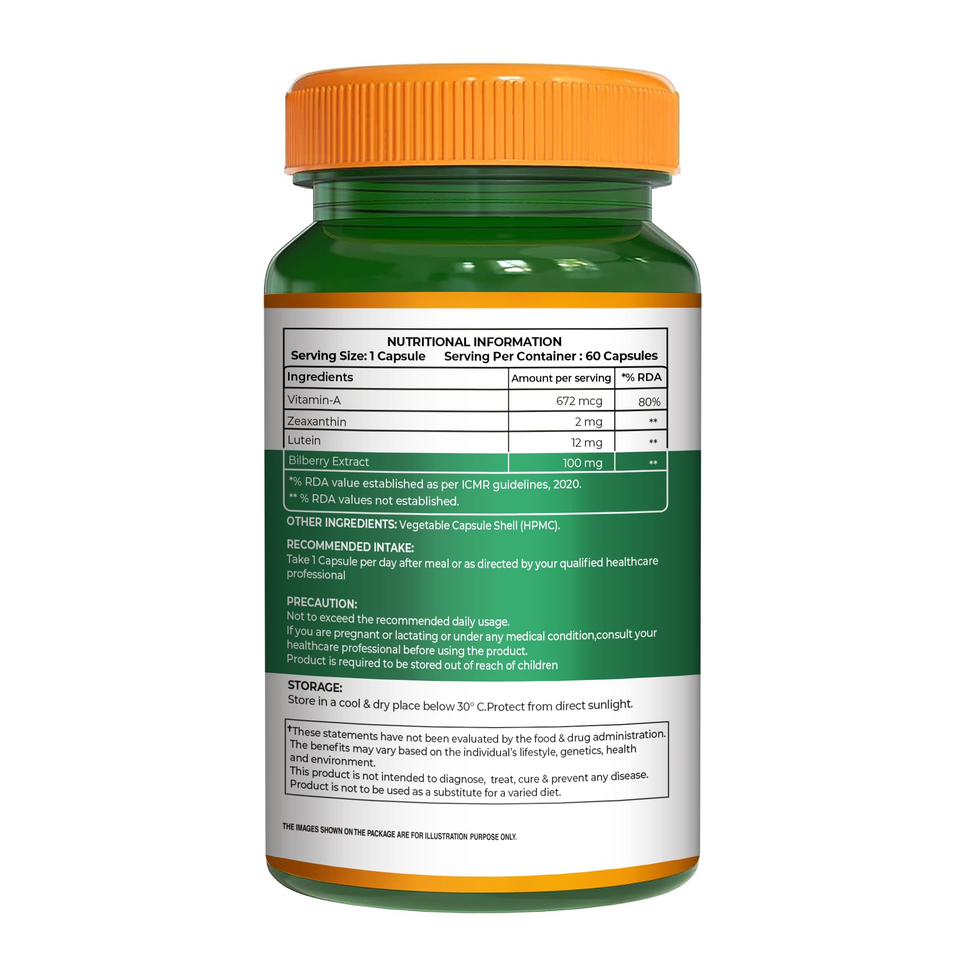 Pure Nutrition Eye Care+ 60 Veg Capsules is a scientifically formulated eye health supplement designed to support retinal health and protect your eyes from digital screen strain and blue light exposure. Each capsule contains a powerful blend of Lutein Zeaxanthin Vitamin A and Bilberry Extractâkey nutrients known to promote visual clarity and protect against oxidative stress. This supplement helps maintain healthy vision supports night vision and provides antioxidant protection for the retina. Ideal for individuals exposed to prolonged screen time or digital devices. Made with vegetarian-friendly ingredients free from gluten soy dairy and artificial additives.