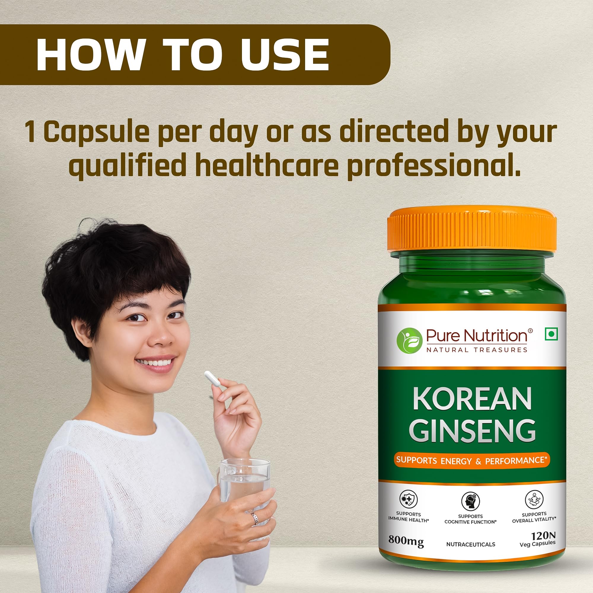 Experience the natural power of Pure Nutrition Korean Ginseng 800mgâformulated to help boost energy focus and overall vitality. Each capsule delivers premium quality ginseng extract to support mental clarity immune health and physical stamina. Ideal for active lifestyles students and busy professionals. Made with vegetarian-friendly ingredients and manufactured in a GMP-certified facility.