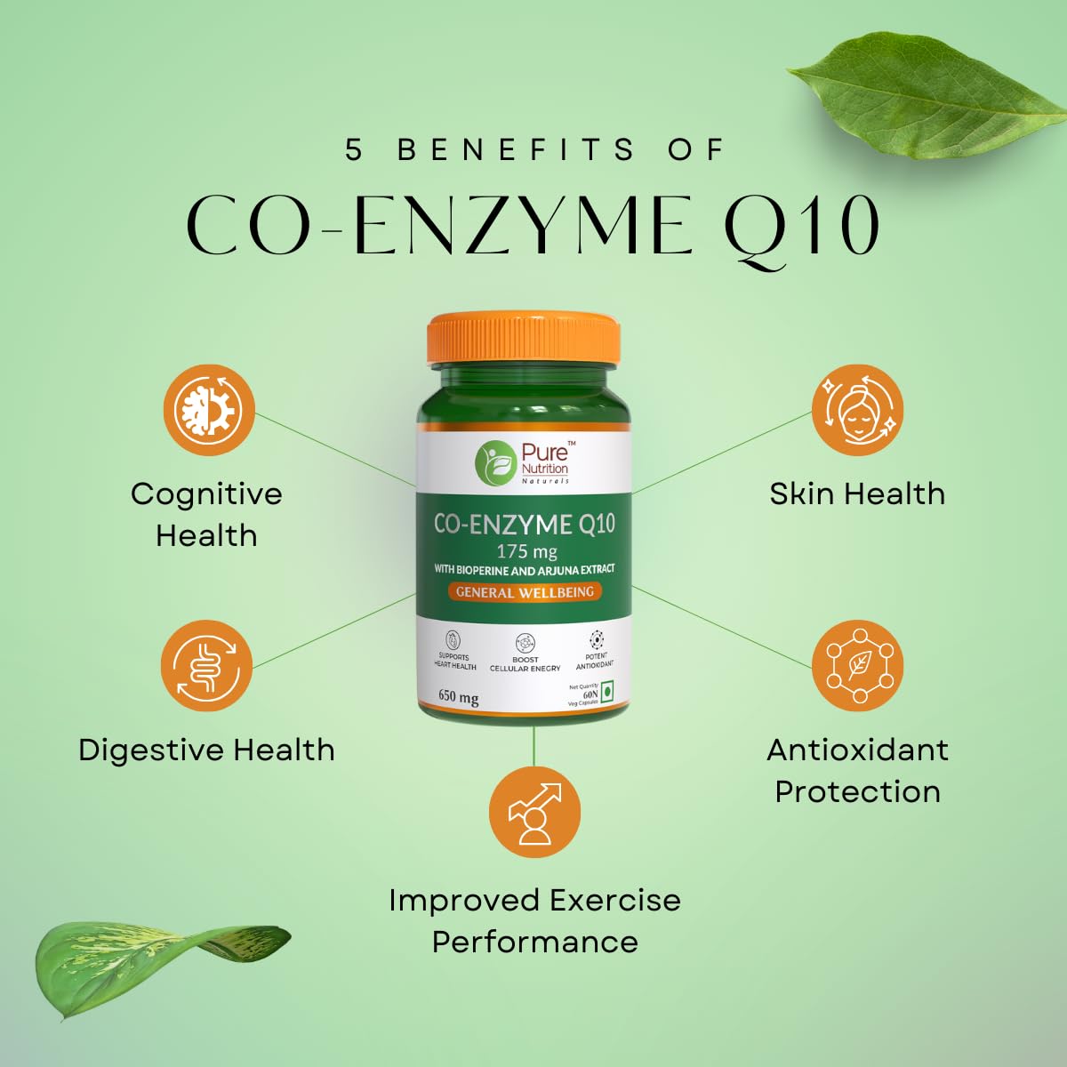 Pure Nutrition Naturals Co-Enzyme Q10 supplement is formulated to energy levels in the body. Coenzyme Q10 is vital for energy production and helps promote cellular growth in the body. The Coenzyme Q10 studies have shown a staggering 144% increase in energy production in the muscle and 56% in the brain. The coenzyme is known to restore brain and nerve cell that may help prevent if not reverse any possible damage to the brain or the central nervous system. Flaxseed Omega in the coenzyme supplement helps fight improve good and protect health. Bioperine lecithin coconut water powder resveratrol and arjuna bark extract provide antithat help oxidative and protects the body from free radical damage. Resveratrol helps expand vessels which improves circulation and s high . Coconut water powder in the supplement provides instant energy while lecithin helps levels. Arjuna bark extract has inotropic anti-ischemic hypoliemic antiatherogenic and antihypertrophic properties. It supports healthy functions and helps lower high . Pure Nutrition Co-Enzyme Q10 benefits those suffering from low stamina generally and o due to problems.