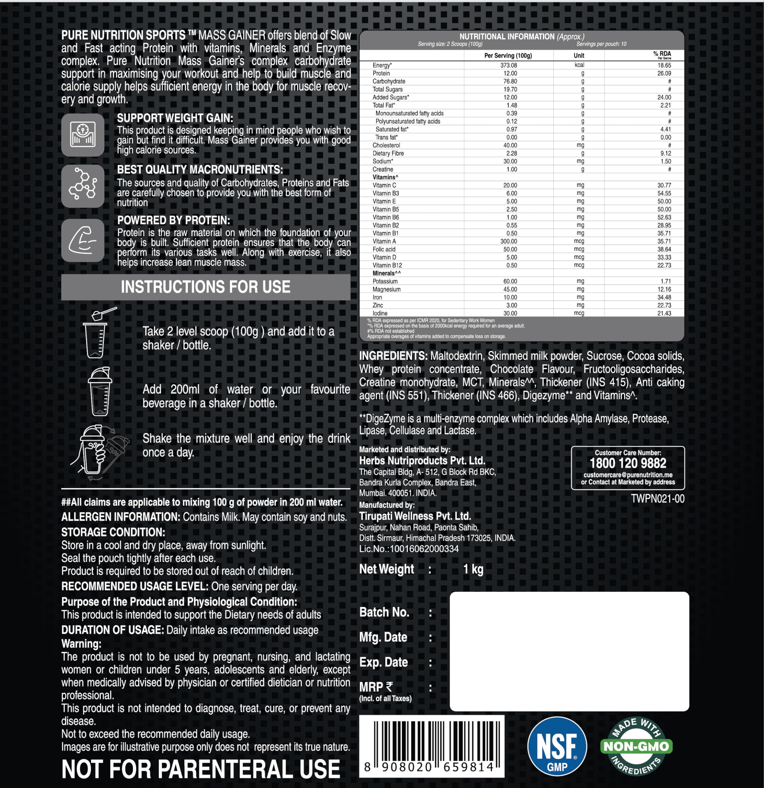 Pure Nutrition Naturals Sports Mass Gainer| Macronutrient blend with vitamins minerCreatine Monohydrate enzymes and MCTs| CHOCOLATE 1 KG POUCH