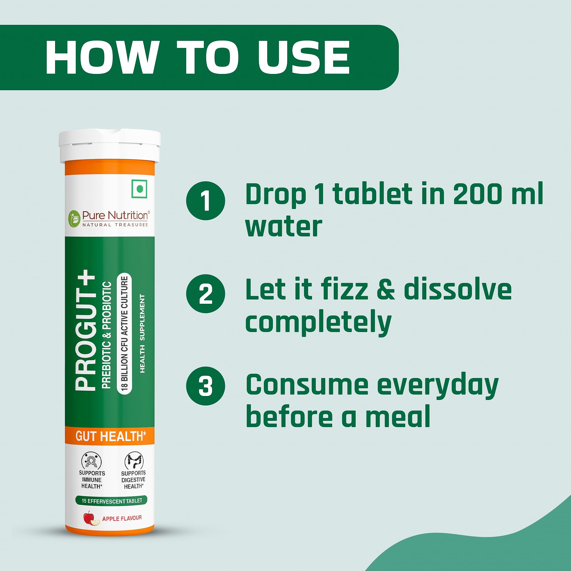 Support your digestive health and overall wellness with Pure Nutrition Progut+ a powerful blend of 18 billion CFU probiotics and prebiotics in a convenient effervescent tablet form. Each tablet is scientifically formulated to help relieve common digestive issues like indigestion constipation gas and bloating while also promoting immune health and nutrient absorption. Infused with a refreshing apple flavor Progut+ is easy to consumeâsimply dissolve one tablet in water and enjoy daily for optimal gut balance.