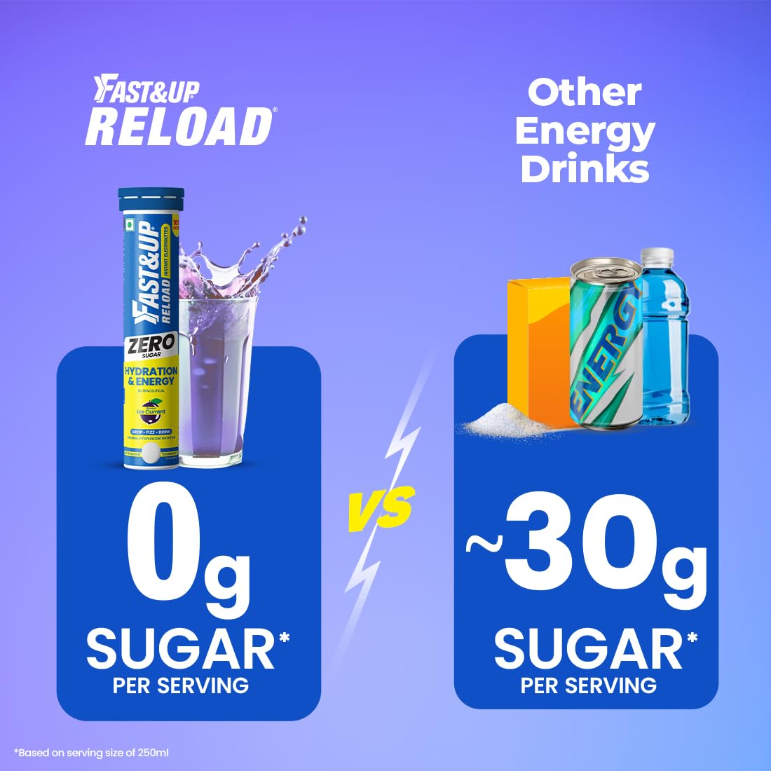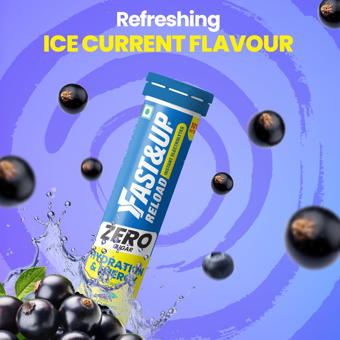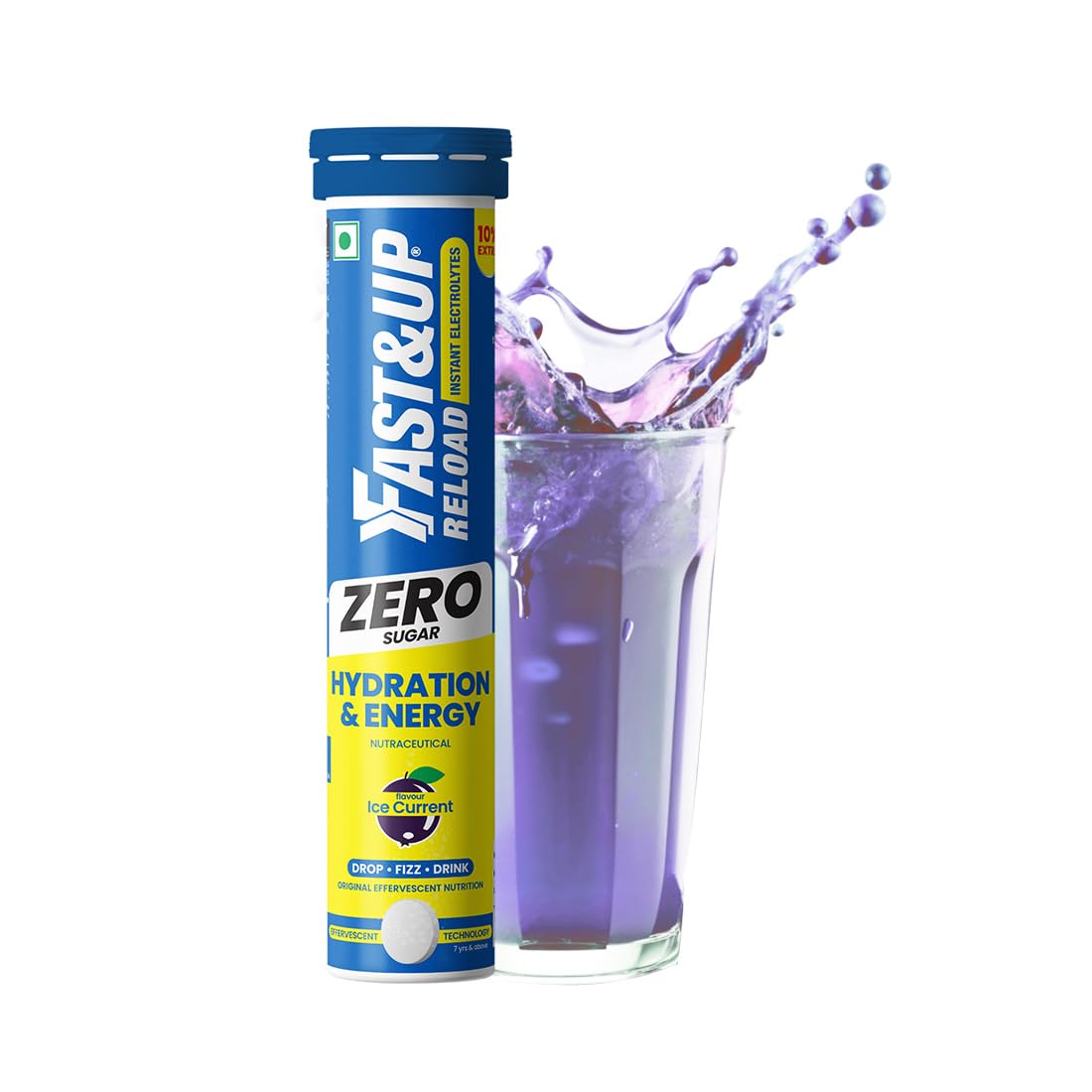 India's Best Selling Energy Drink now in a new zero sugar variant Fast&Up Reload Zero with ideal combination of Electrolytes and Vitamins to rehydrate and maintain electrolyte balance that keeps you active. Reload Zero contains 5X more essential electrolytes than that present in water alone such as Sodium Potassium Magnesium Calcium & Chloride which helps replenish lost electrolytes in sweat and helps maintain fluid & electrolyte balance & supports energy production. Added Vitamin B12 & C helps re energize the body and prevent fatigue and exhaustion. Fast&Up Reload Zero contains zero sugar making keto & diabetic friendly. Reload is specially designed to provide a hypotonic solution drink which speeds up the rehydration process & provides 2X faster energy and hydration. Fast&Up Reload formulated with Premium Swiss Effervescent Technology which provides faster hydration with fast acting electrolytes provides rapid absorption and action and is gentle on stomach. Fast&Up Reload 100% vegetarian and available in refreshing Ice Current flavour.