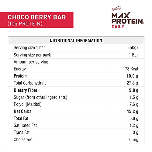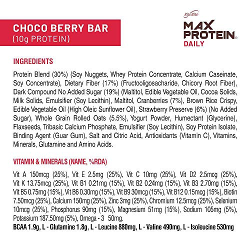 Protein Blend Fiber Vitamins & Minerals No Preservatives 100% Veg No Added Sugar For Energy Fitness & Immunity. A BAR FOR EVERYONE: With 10gms of protein in each bar and 5gms of fiber and goodness of berries. Max Protein Choco Berry protein bar is the pe