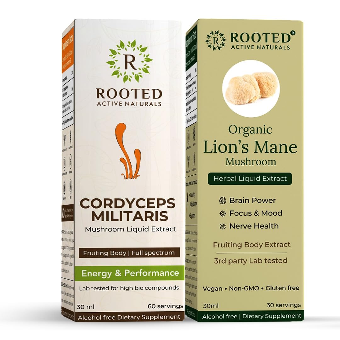 Unlock the power of medicinal mushrooms with Rooted Active Cordyceps and Lion Mane Mushroom Tinctures. This dual-extract bundle is designed to enhance cognitive function boost energy and support overall well-being. Rooted Active Cordyceps Mushroom Tincture (30ml) A full-spectrum alcohol-free liquid extract of Cordyceps Militaris known for its ability to enhance stamina endurance and respiratory function. Rooted Active Lion Mane Mushroom Tincture (30ml) A potent fruiting body extract of organic Lion Mane mushrooms formulated to support memory focus and nerve health.