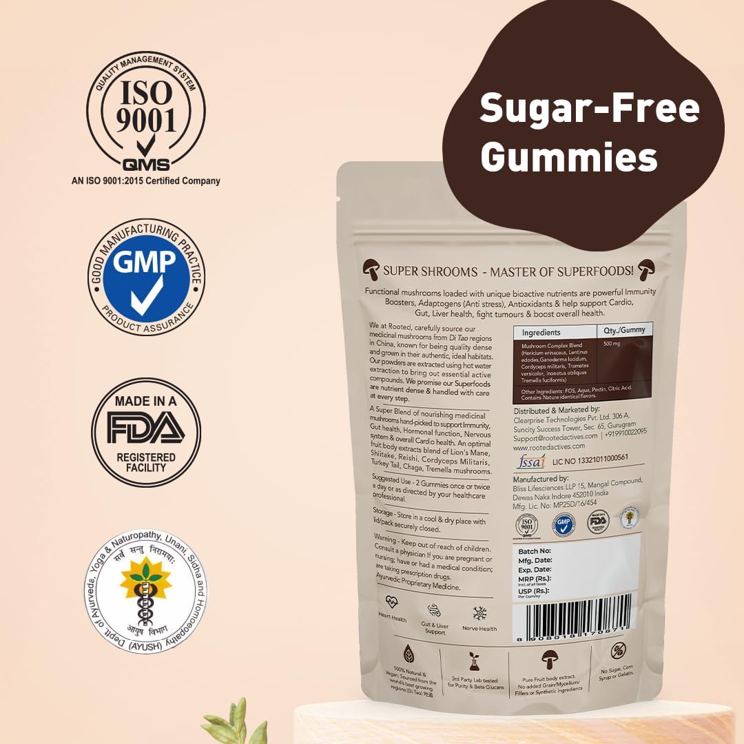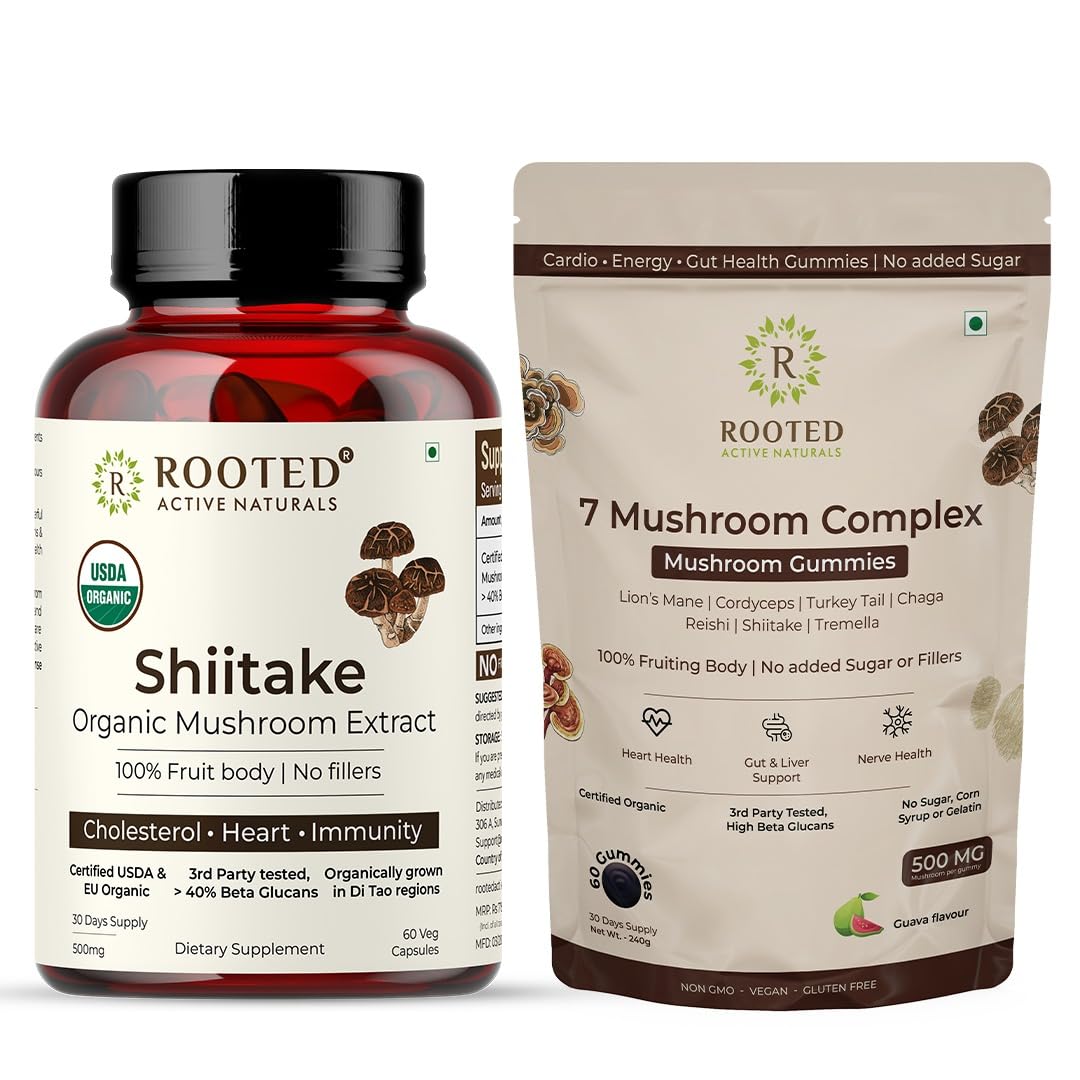 Promote heart health immune function and overall vitality with Rooted Active Naturals Shiitake Capsules and 7 Complex Gummiesa potent blend of organic mushroom extracts for daily wellness. Shiitake Capsules (60 Caps) 100% fruiting body extract rich in beta-glucans designed to support cholesterol levels cardiovascular health and immune balance. 7 Complex Gummies (60 Gummies) A sugar-free guava-flavored blend of seven powerful mushrooms: Lion Mane Cordyceps Turkey Tail Reishi Chaga Shiitake and Tremella for complete wellness.