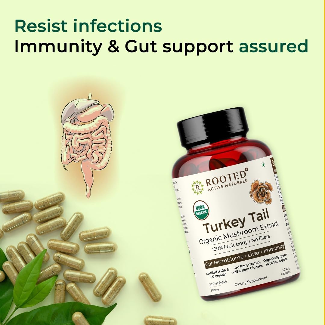 Support your gut liver and immune system with Rooted Active Naturals Turkey Tail Capsules and 7 Complex Gummiesa powerful combination of organic mushroom extracts designed for daily wellness. Turkey Tail Capsules (60 Caps) Made from 100% fruiting body extract rich in beta-glucans to promote gut health liver function and immune balance. 7 Complex Gummies (60 Gummies) A sugar-free guava-flavored gummy featuring Lion Mane Cordyceps Turkey Tail Reishi Chaga Shiitake and Tremella for full-spectrum support.