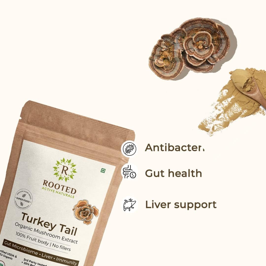 Boost your immune system and overall vitality with Rooted Active Naturals' Turkey Tail & Chaga Mushroom Powder. This powerful duo combines two of nature most potent functional mushrooms to provide gut health support antioxidant protection and immune-boosting benefits. Turkey Tail Mushroom Powder A rich source of prebiotics & beta-glucans Turkey Tail supports gut microbiome health digestion and immune function. Chaga Mushroom Powder Known as the âKing of Medicinal Mushroomsâ Chaga is packed with antioxidants polyphenols and adaptogenic compounds to promote cellular health and overall wellness. Both powders are 100% pure organically sourced and free from fillers additives or artificial ingredients.