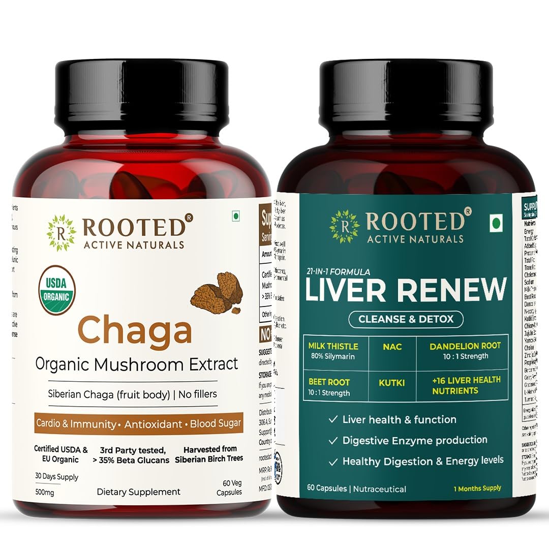 The Liver Defense Combo combines Liver Renew Capsules and Chaga Mushroom Capsules (60+60 capsules) to offer a well-rounded blend of botanical extracts and whole mushroom powder in one convenient pack. Liver Renew is formulated with carefully selected plant-based ingredients while Chaga Mushroom Capsules provide pure whole mushroom powder with no artificial additives. This vegan non-GMO and gluten-free combo contains no fillers or preservatives ensuring a high-quality clean-label supplement for daily use.