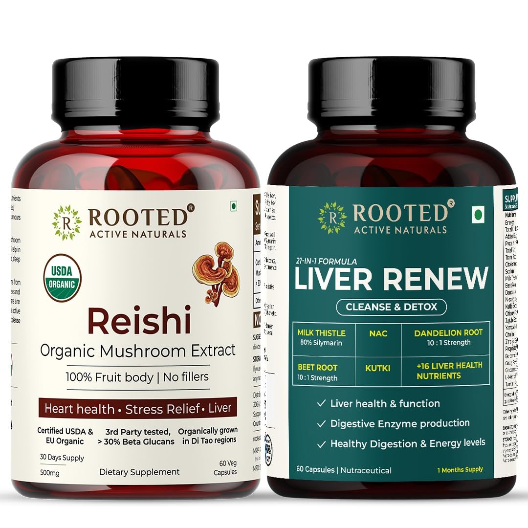 Rooted Actives Liver Renew & Reishi Mushroom Capsules (Pack of 2 60 caps each) offer a carefully crafted herbal and mushroom blend in convenient capsule form. Made with plant-based ingredients these capsules are vegan non-GMO and gluten-free with no artificial fillers or additives. This easy-to-use supplement is a great addition to any wellness routine eliminating the need for powders or complex preparations. With a pack of 2 you get a versatile and convenient supply for daily use.