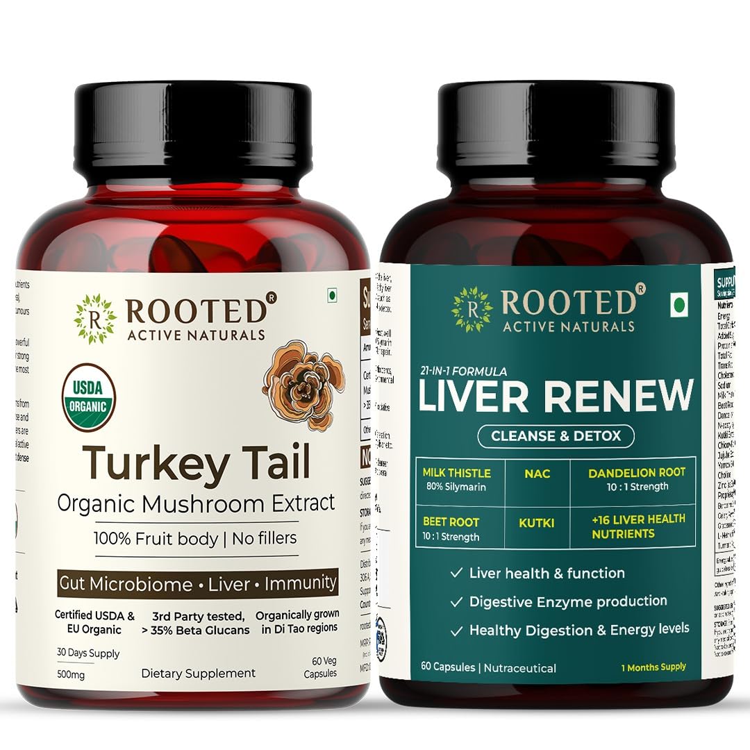 Rooted Actives Liver Renew & Turkey Tail Mushroom Capsules (60+60 capsules) combine botanical extracts and functional mushrooms into a single convenient supplement pack. Liver Renew features a blend of carefully selected plant-based ingredients while Turkey Tail Mushroom Capsules contain whole mushroom powder with no artificial additives. This vegan non-GMO and gluten-free combo offers clean-label ingredients free from fillers or preservatives. Designed for daily use these easy-to-take capsules fit seamlessly into any lifestyle.