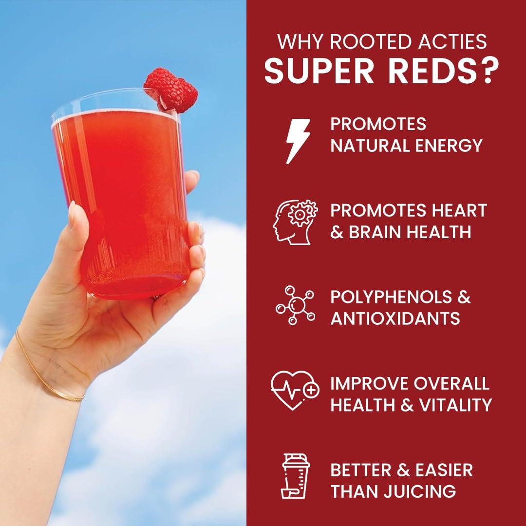 Rooted Super Reds is a convenient way to include 21 fruits & berries into your daily diet. Featuring superfood product that contains essential vitamins and minerals. Every serving delivers vitamin C and zinc - a combination that helps to maintain a normal