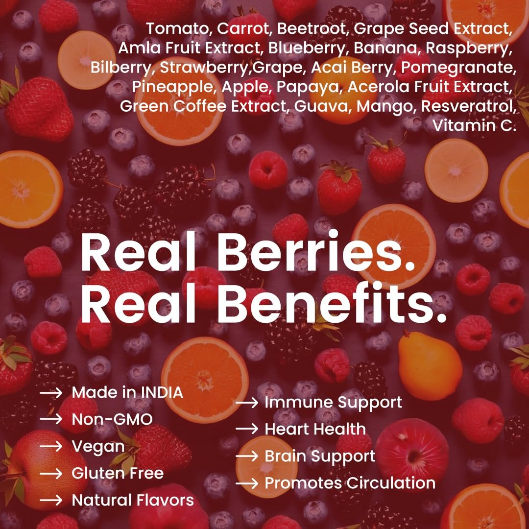 Rich in enzymes to help fight free radicals; Non GMO 100% Vegan Enjoy the super nutrition of fruits & berries such as Grapes Raspberry Beet Root Strawberries Acai Berry Pomegranate Apple Papaya Pineapple etc. - All without the hassles of juicing Simply ad