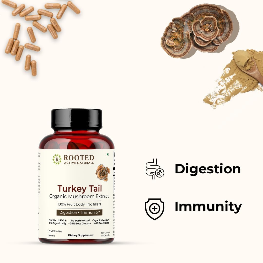 Rooted Active Turkey Tail Mushroom Capsules (Pack of 4 60 caps each) contain 100% whole mushroom powder carefully sourced and processed for quality. These vegan non-GMO and gluten-free capsules are free from artificial fillers or additives offering a clean-label choice. Designed for convenience these capsules require no mixing or brewingsimply take with water. The bulk pack of 4 provides great value and an extended supply for consistent use.