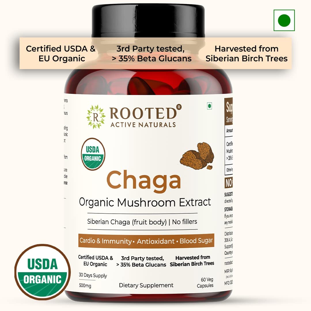 Rooted Actives Siberian Chaga Mushroom Capsules (60 Caps 500 Mg) | Blood Sugar Heart & Immunity | Usda Organic | 35% Beta Glucans | Pack Of 2