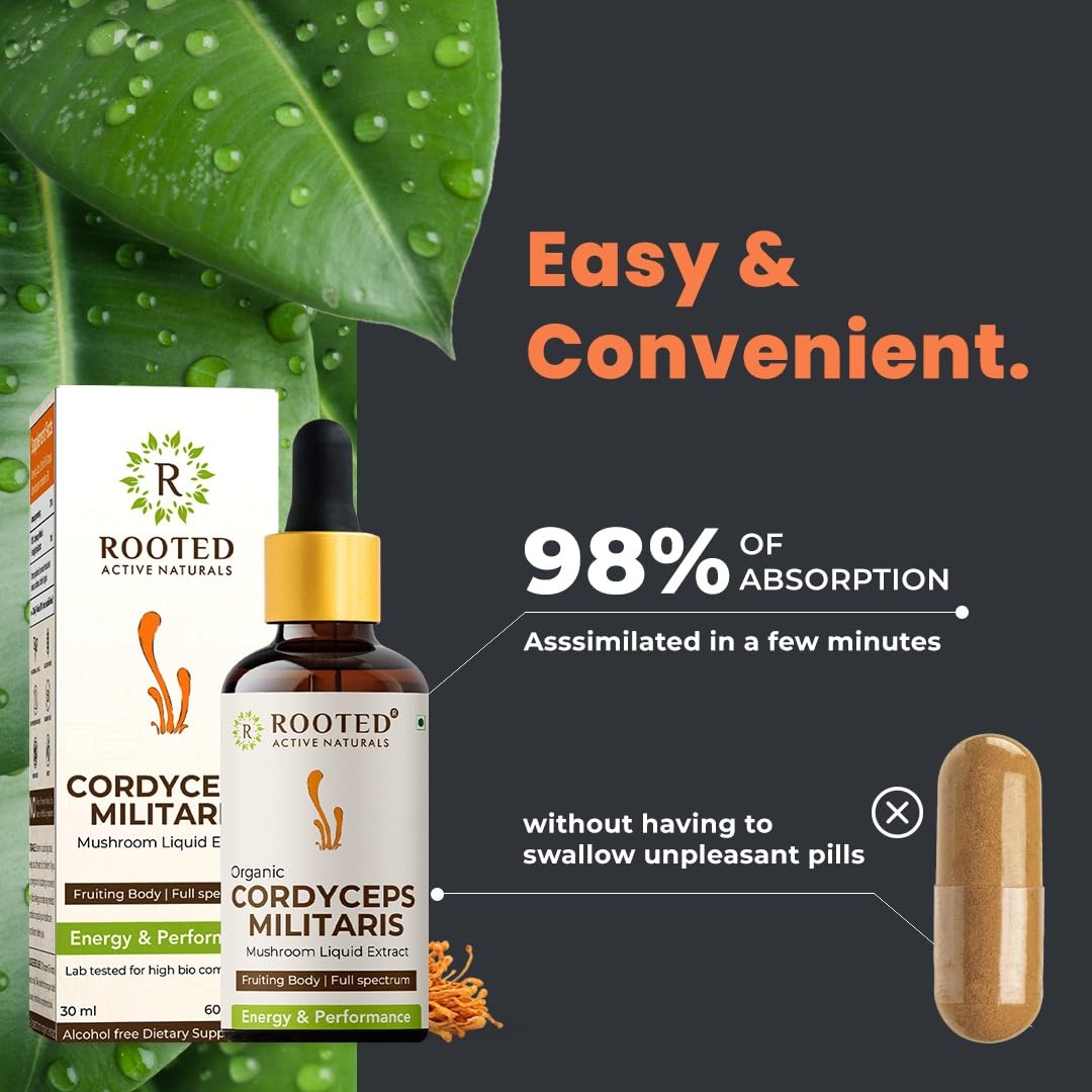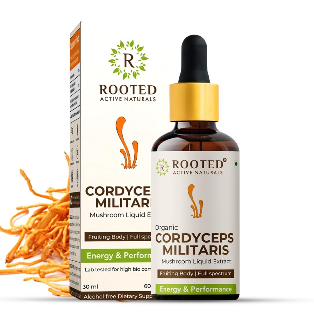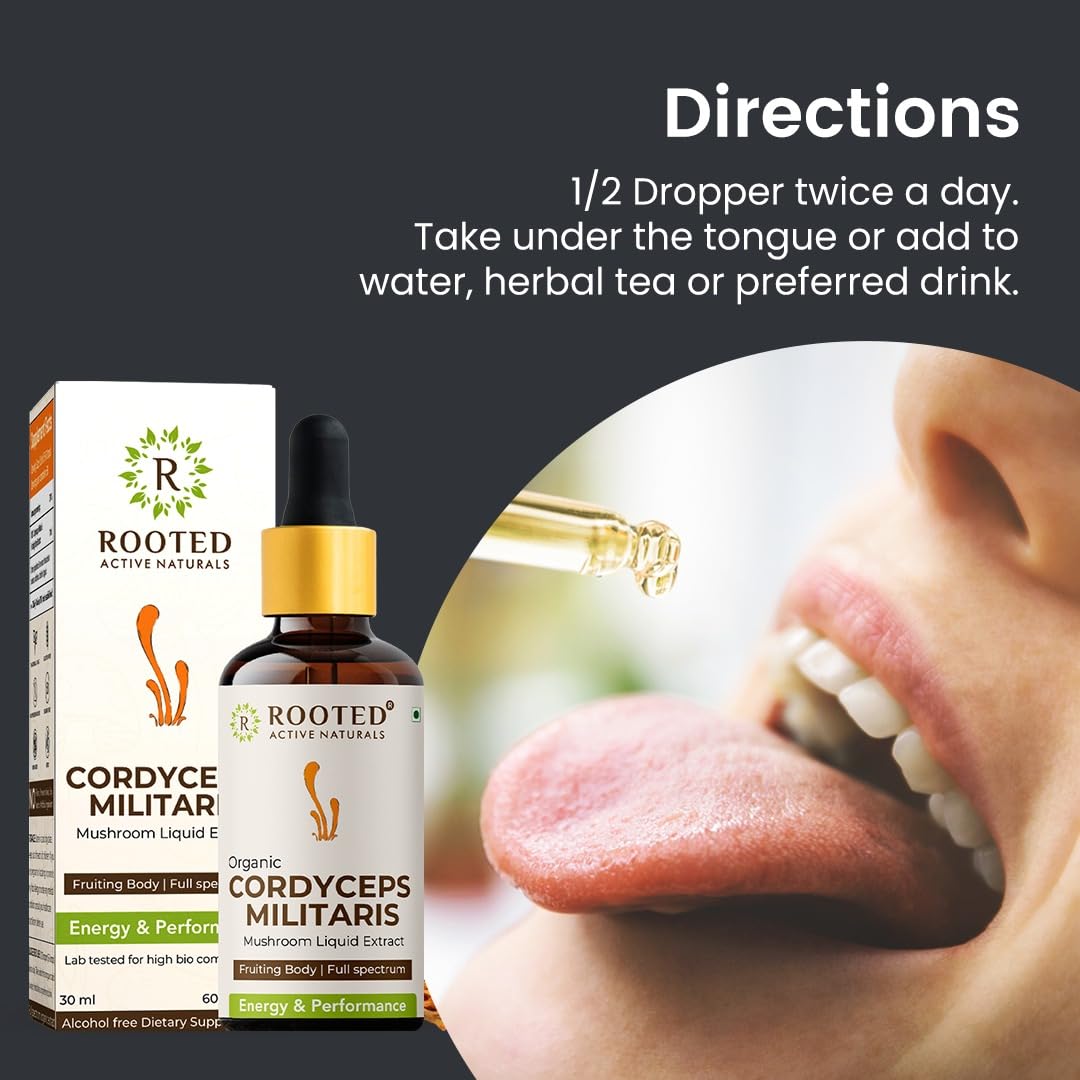 R ROOTED ACTIVE NATURALS Cordyceps Mushroom Supplement Organic Extract Tincture | For Energy Stamina Supports Respiratory & Kidney Health| Non Gmo No Alcohol Exctract | 30 Ml - 60 Servings