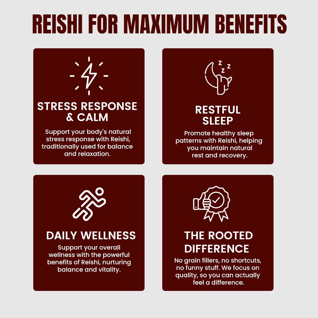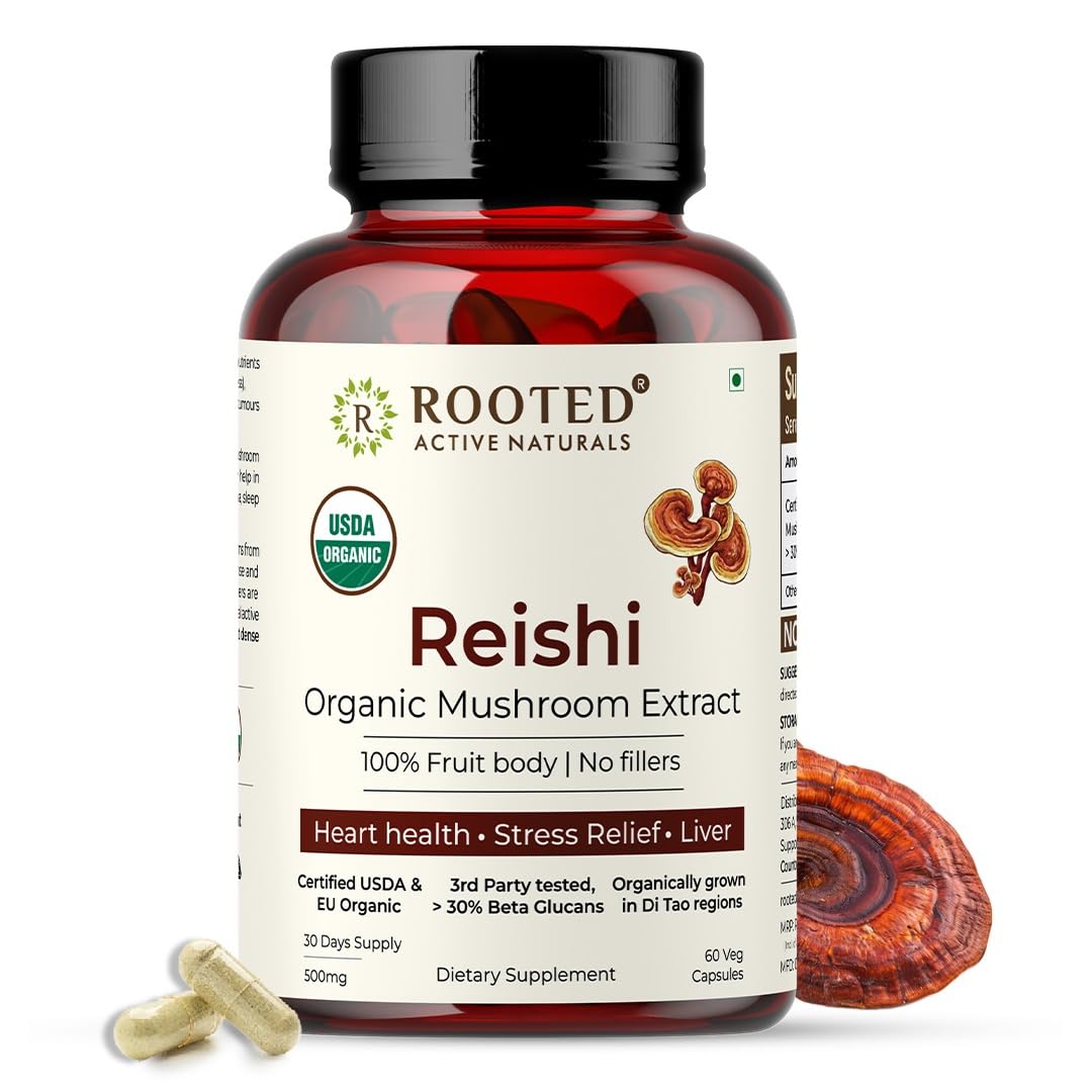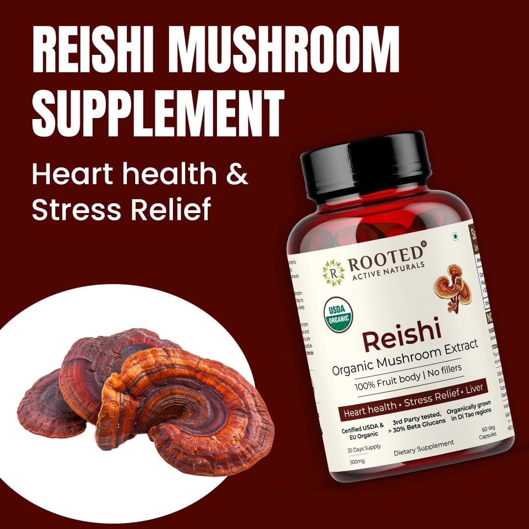 Rooted Active's Reishi Mushroom - Heart & Immune Health Support Supplement | Mushroom Supplement to Support Energy Mood Sleep & Aid Overall Well-Being - 60 Capsules