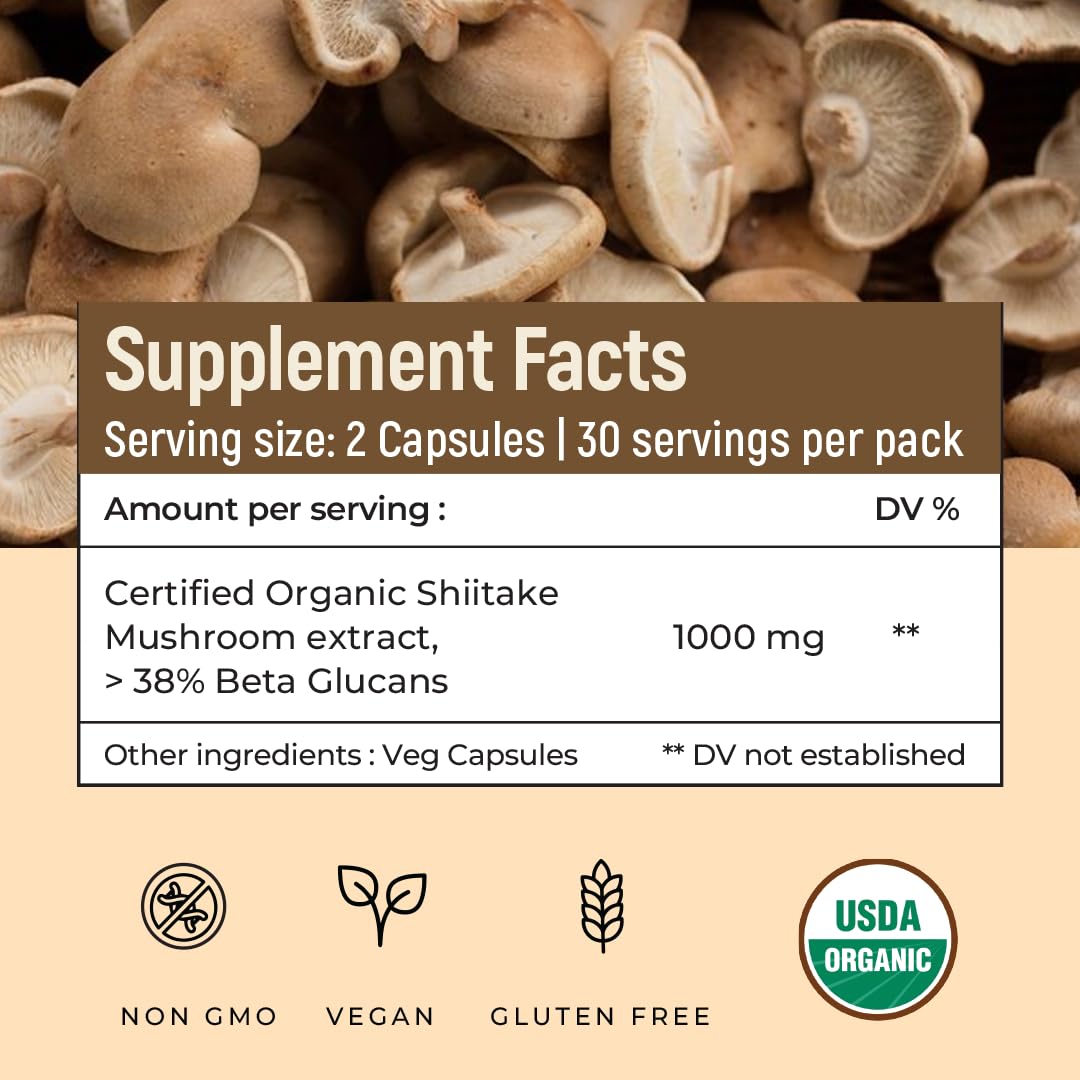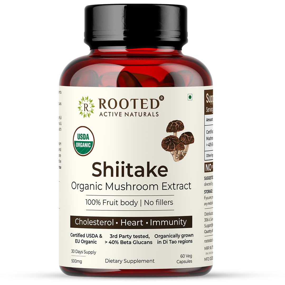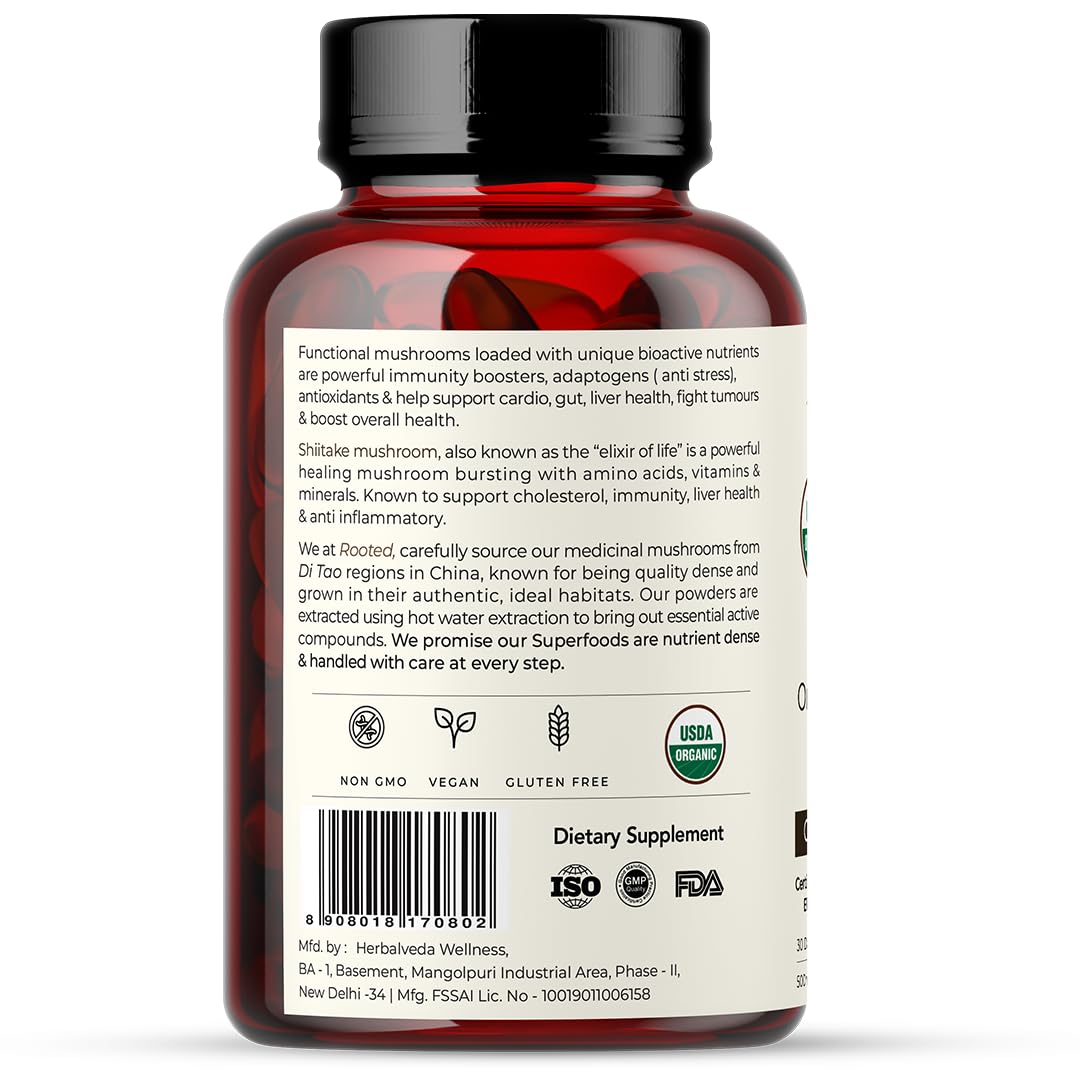 Rooted Shiitake Mushroom 60 Capsules 500 mg | Supports Healthy Cholesterol & Helps BP Levels |Immunity Heart Skin & Hair Health & Weight Control