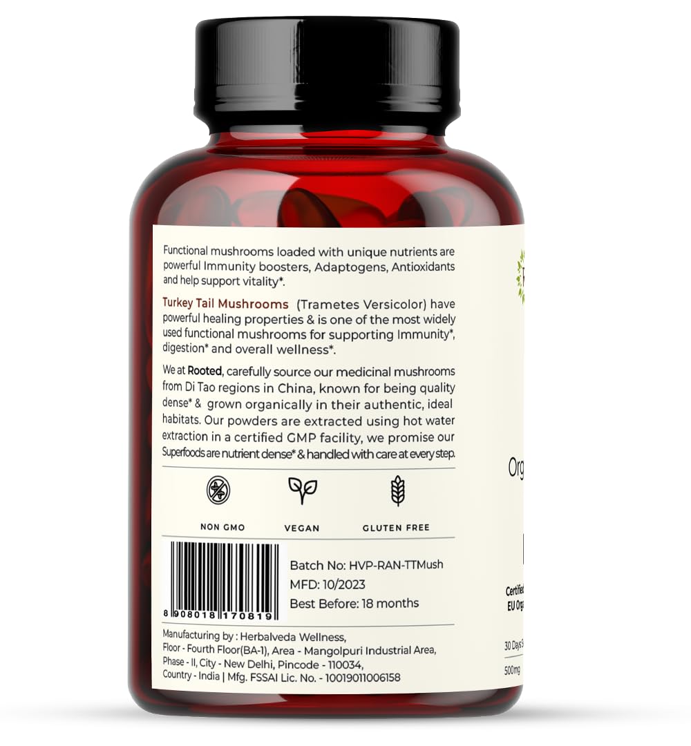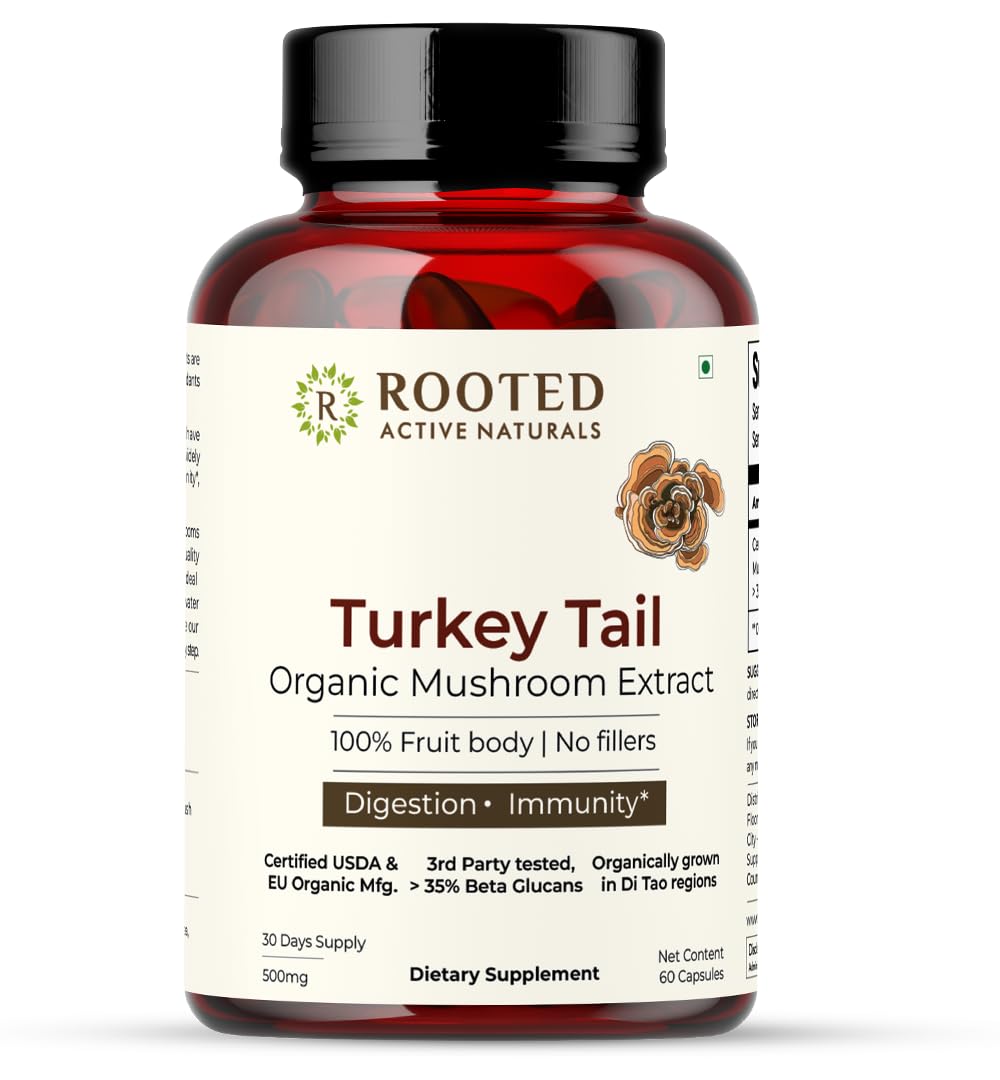 Rooted Turkey Tail mushroom Extract Capsules (60 Veg Caps 500 mg) | Heart health Stress Relief Liver. USDA Organic 30% Beta Glucans Certified organic