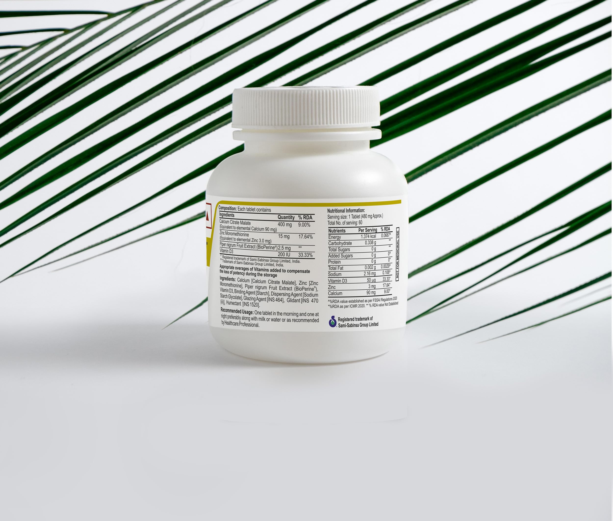 Calci D Max is a potent combination of clinically proven ingredients to support bone health. Formulated with the combination of Calcium Citrate Malate Vitamin D3 Zinc and BioPerine. BioPerine enhances the bioavailability of all the above ingredients.