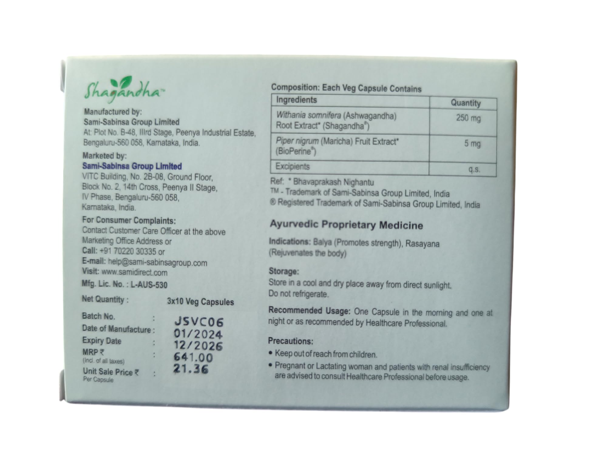 Shagandha by Sami Direct is a premium health supplement formulated with a standardized extract of Ashwagandha (Withania somnifera) a renowned adaptogenic herb in traditional Ayurveda. This product is designed to help promote overall wellness reduce stress and enhance vitality making it a powerful addition to your daily health routine. Unique Features: Standardized Extract: Ensures consistency and potency delivering optimal benefits of Ashwagandha. Natural & Safe: Derived from natural sources free from harmful additives. Backed by Science: Developed using Sami Direct expertise in innovative and evidence-based formulations.