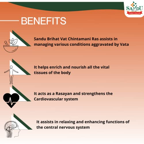 pSandu Brihat Vat Chintamani Ras strengthens and rejuvenates the nervous & musculo-skeletal system. It strengthens the heart and is useful in conditions caused due to cardiac disorders. Further it improves mental health memory retention & recall. It beneficial in disorders associated with joints and muscles. Improves the memory when given along with Sandu Saraswatarishta. it is useful in various paralytic conditions arthritis and various heart problems./p pAbout Brand:-/p pSandu Pharmaceuticals also popularly called Sandu Ayurveda by people is one of the renewed brands when it comes to Ayurvedic health care products or medicines. Sandu Ayurveda Medicines are backed by a rich heritage and more than 120 years in the manufacture and marketing of Ayurvedic medicines./p pSandu is an ISO 9001:2000 certified group of companies. It is the best place to explore the world of Ayurveda ayurvedic medicines and to buy medicines online. Ayurveda has been a part of the great heritage of Indian science. During British rule Ayurveda was not considered an idealistic way of medicine and was looked down upon by modern classes but it was during these adverse times that a few inspired people staked their lives to restore glory to this magnificent legacy./p pThe name ââ¬ÅSanduââ¬Â leads in this roll call of honour. On 10th May 1899 Sandu Brothers chose to revolutionise my opinion wrong word can be reinvented the manufacturing of Ayurvedic medicines. Their commitment to spread and educate about the goodness of Ayurveda and bringing health even to the poor are the ideals that have been the foundation of their success./p pThe name Sandu now stands as a benchmark of quality amongst doctors practitioners and common people alike./p