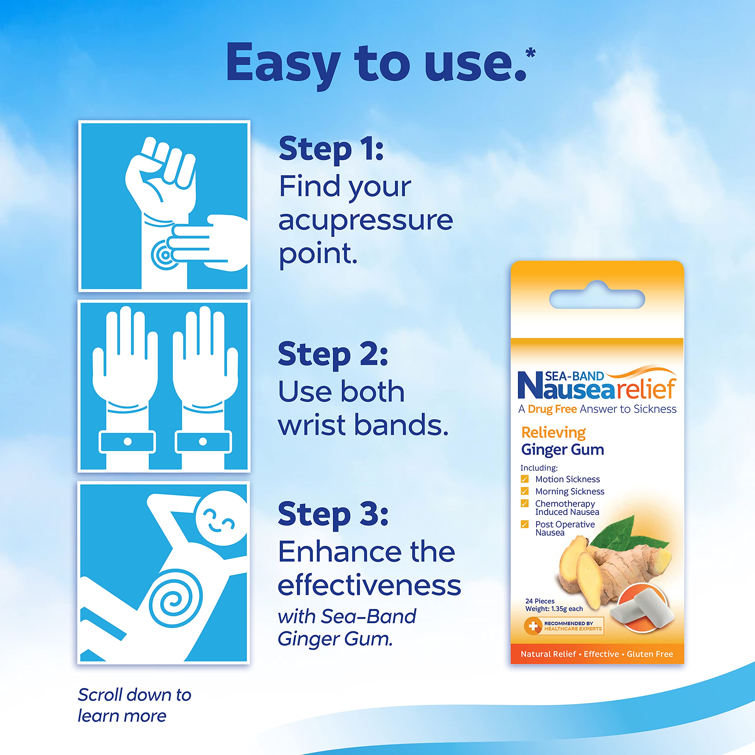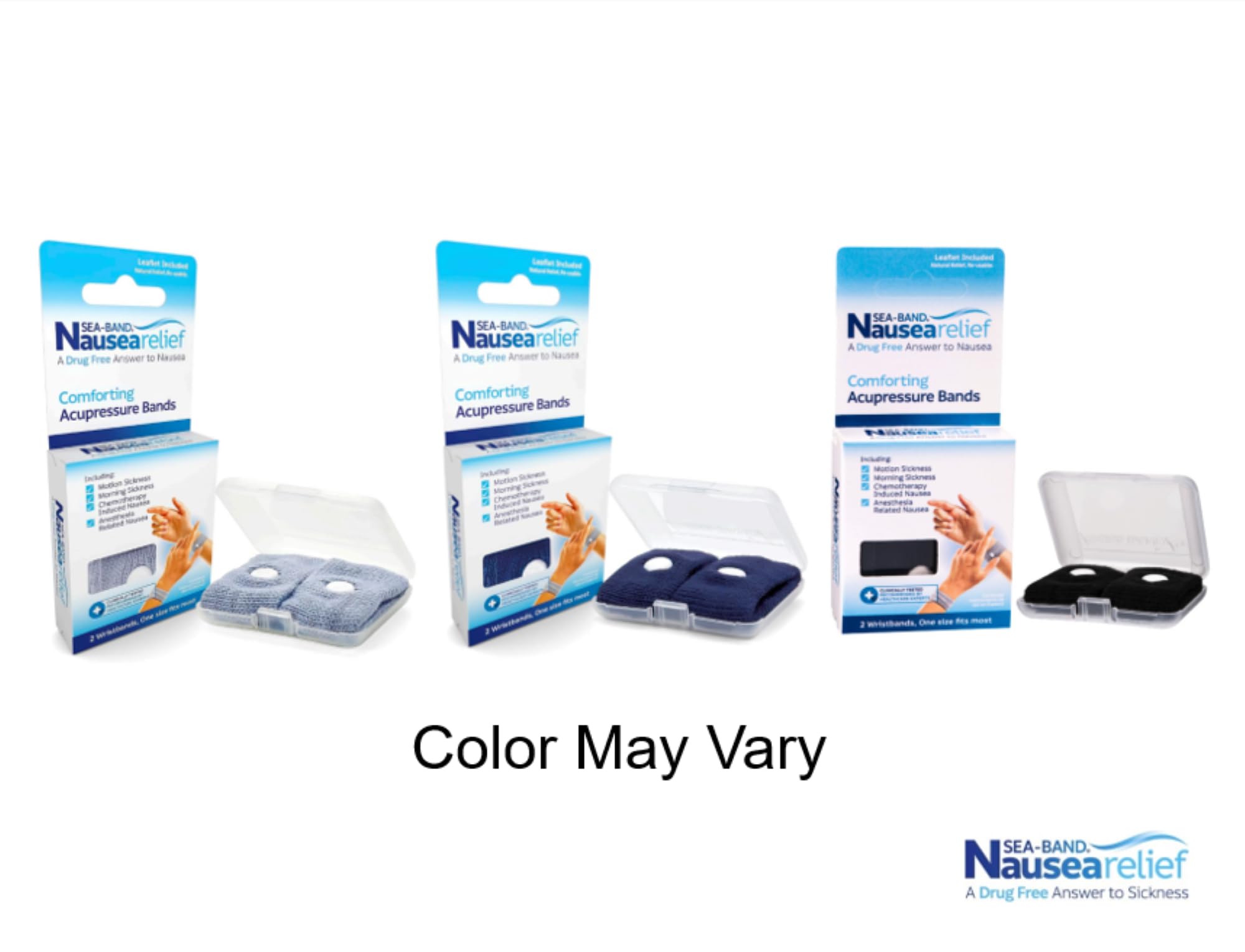 Sea-Band is a family friendly drug-free solution effective for most types of nausea. Completely natural Sea-Band uses acupressure wristbands to gently restore balance to your body. No drugs. No side effects. Clinically tested. Suitable for most types of sickness and nausea. Sea-Bands is a knitted elasticated wristband that works because of a plastic knob sewn into the side of the inside of the wrist-band which exerts pressure and stimulates the P6 or Nei-Kuan acupressure point. It was been proven that pressure on this point relieves nausea and vomiting. Sea-Bands work immediately and can be worn whenever you feel nauseous. This product can be used continuously and has repeated multiple uses. Sea-Bands are suitable for use by adults and children from the age of 3 and up and is sold in different colors.