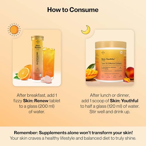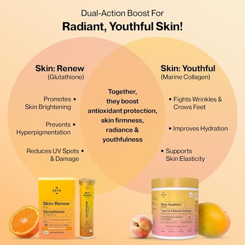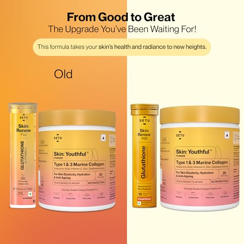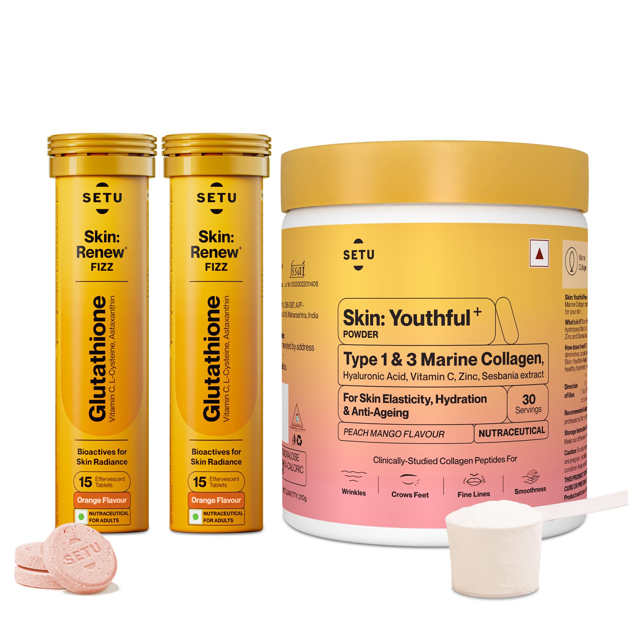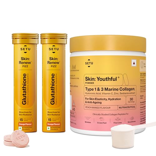 SETU Skin Renew Glutathione Fizz 30 Tablets For Skin Glow & Brightness With Skin Youthful Collagen Powder (Peach Mango,210 G) Fight Fine Lines & Wrinkles For Women & Men, 3 count, 15 capsules
