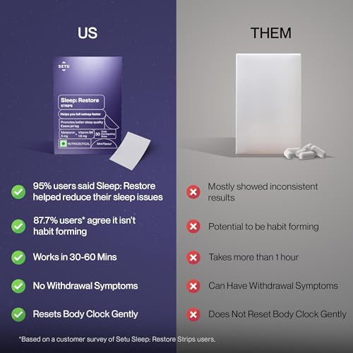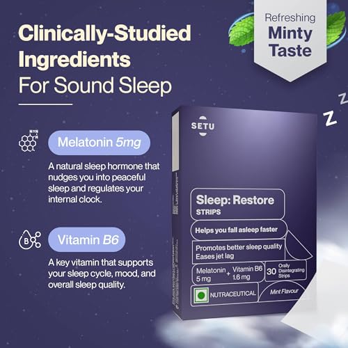 • UNIQUE MINT-FLAVORED MELATONIN STRIPS: Setu Sleep Restore Strips (30 strips - Pack of 1) feature 5mg of Melatonin a natural sleep hormone that supports restful sleep. Enhanced with vitamin B6 for reduced tiredness and increased relaxation our mint-flavore