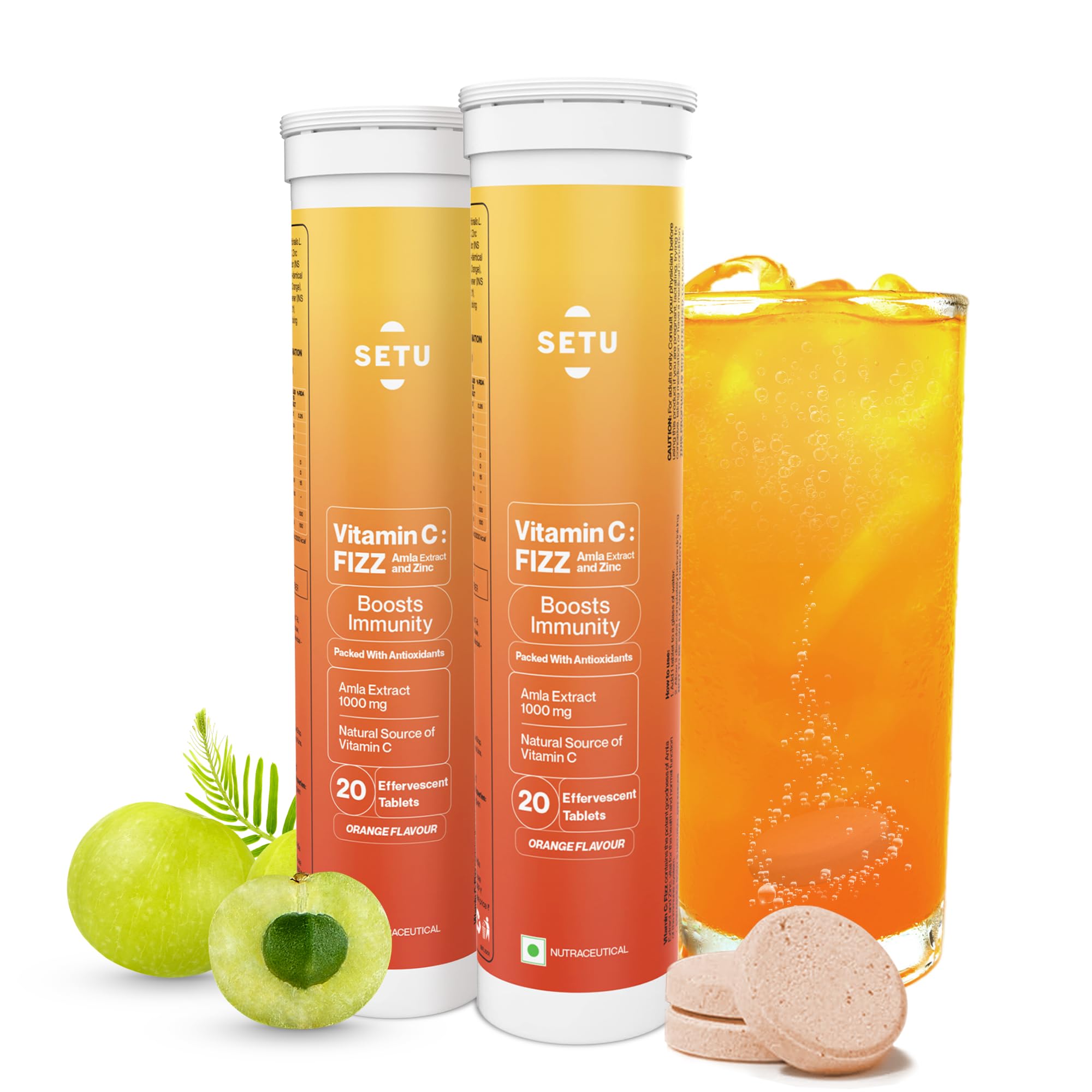 Setu Vitamin C: Fizz - 40 Effervescent Tablets (Pack of 2) | Amla Extract and Zinc Boost Immunity Skin | Orange Flavour
