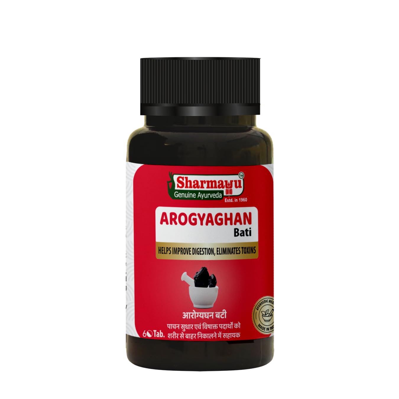 Sharmayu Arogyaghan Bati (Arogyavardhini Bati) is a potent Ayurvedic formulation that promotes overall digestive health detoxifies the body and supports liver and spleen function. Enriched with time-tested herbs like Kutki Triphala Neem and Shuddha Shilajit this supplement aids in relieving constipation acidity bloating and abdominal discomfort. It also purifies the blood and helps manage obesity skin disorders anemia and sluggish metabolism. Its detoxifying action supports liver rejuvenation and improves overall vitality. Ideal for those seeking a natural solution for digestion weight control and skin wellness. Made from 100% Ayurvedic ingredients this tablet is safe for regular use and manufactured in a GMP and ISO-certified facility. Suitable for adults of all ages.