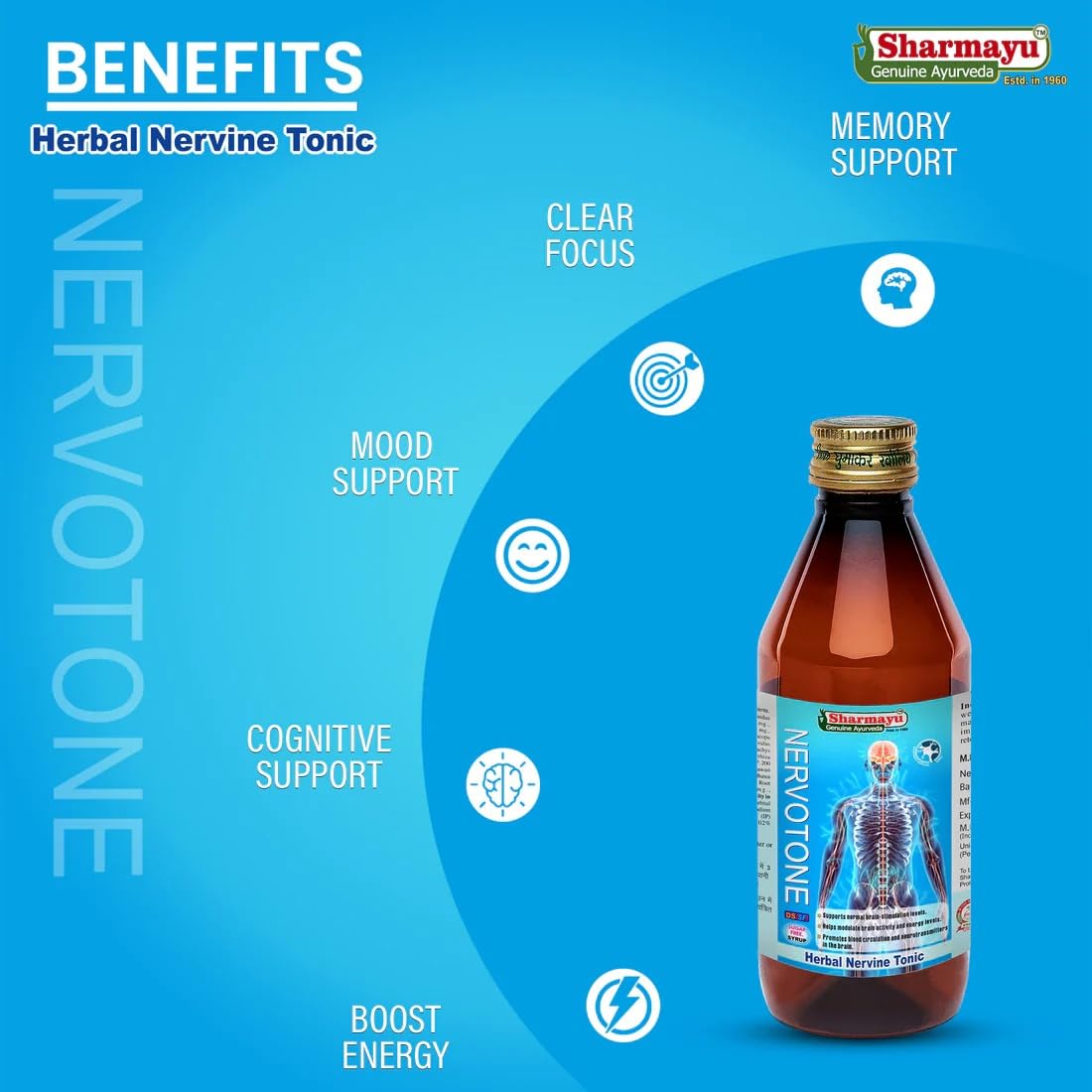 Sharmayu Nervotone Herbal Nervine Tonic is a trusted Ayurvedic formulation designed to support brain and nervous system health. It is enriched with powerful herbal ingredients that help maintain normal brain-stimulation levels modulate brain activity and support energy balance. Nervotone promotes healthy blood circulation and assists the brain's natural neurotransmitter functions making it ideal for those experiencing nervous weakness or mental fatigue. This tonic also helps neutralize damaging free radicals in the body further supporting cognitive and nervous health. Recommended for adults and children alike Nervotone offers a natural herbal alternative for maintaining mental sharpness and vitality.