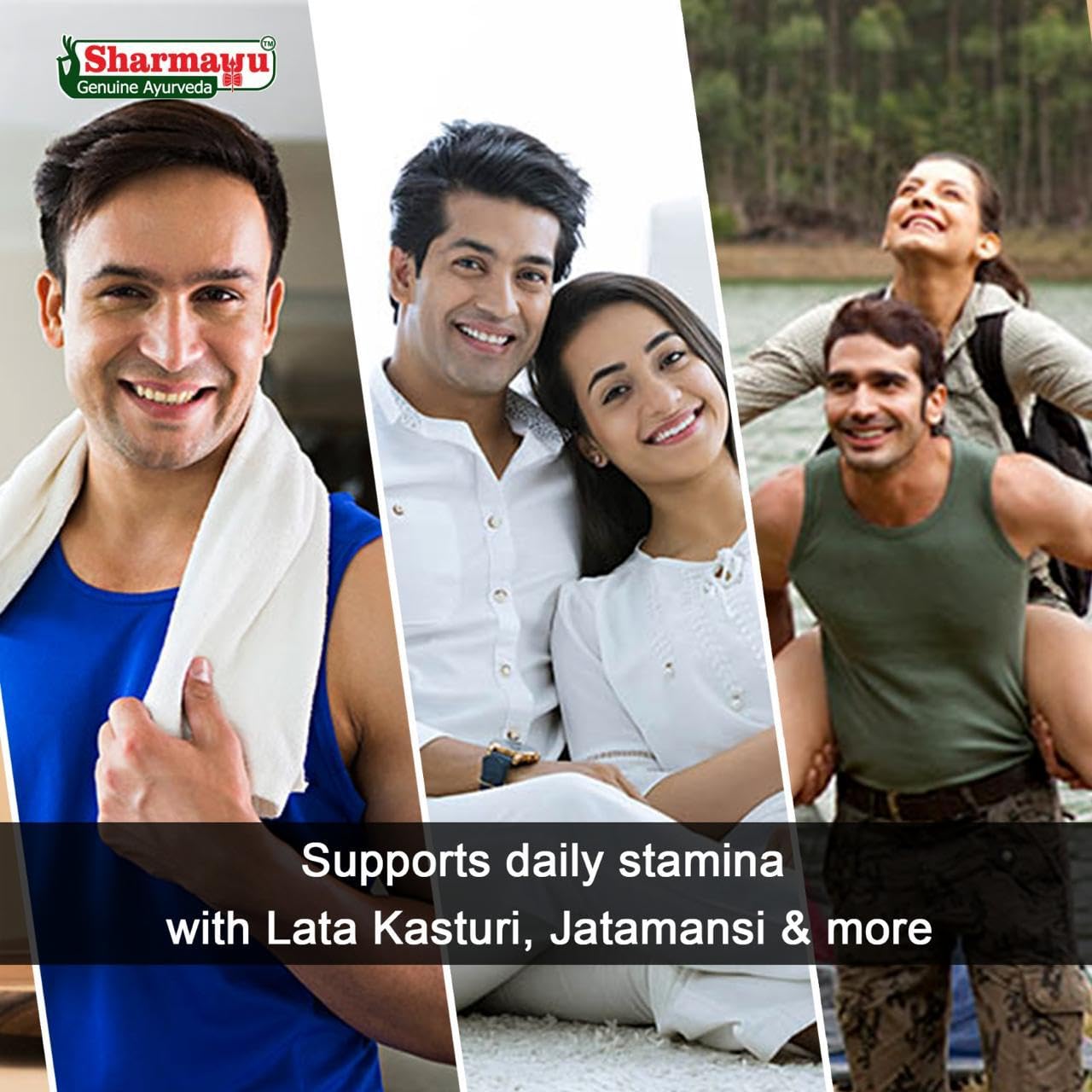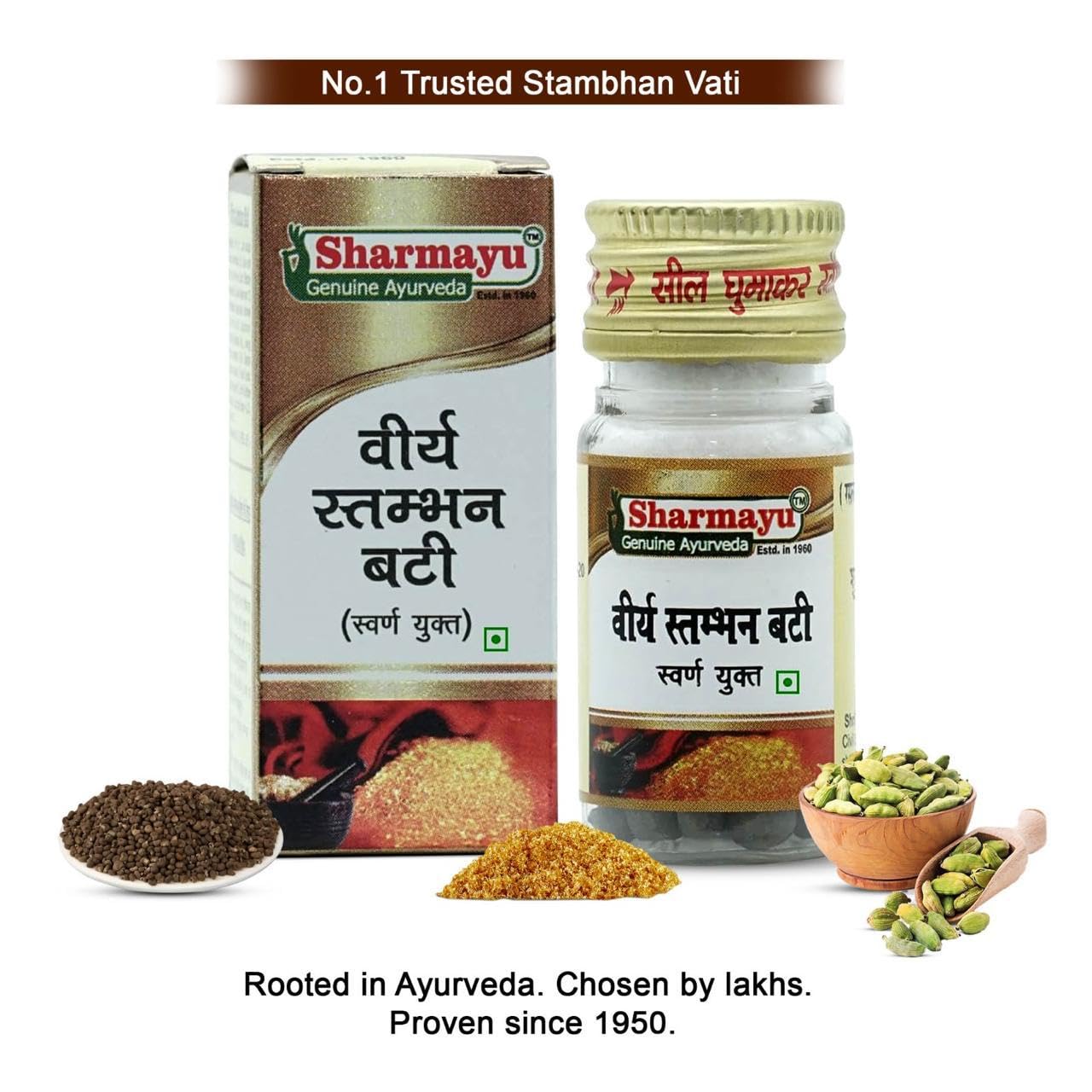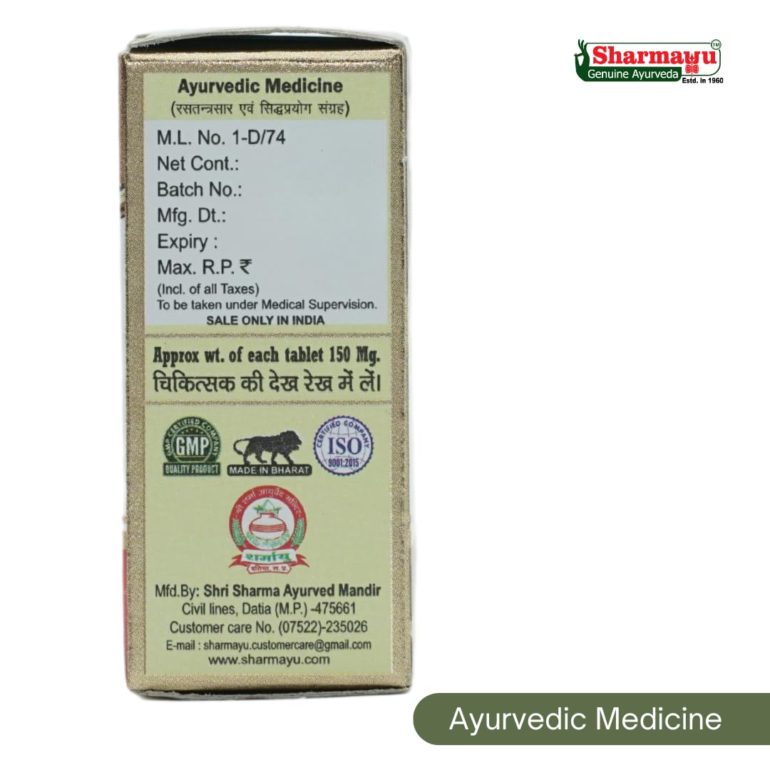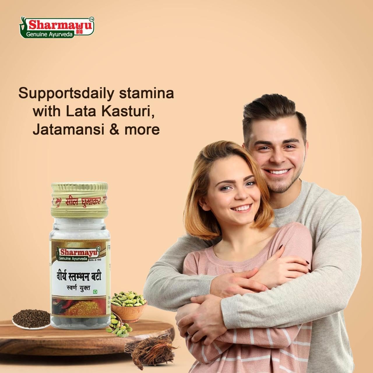 Sharmayu Viraya Stambhan Bati (Swarna Yukta) is a traditional Ayurvedic supplement crafted to support overall wellness and vitality. It is prepared using a unique blend of herbs such as Lata Kasturi Elaichi Jatamansi and other natural ingredients following classical Ayurvedic formulations. This supplement contains Swarna Vark (gold leaf) which has long been used in Ayurveda for enhancing the effectiveness of herbal combinations. Suitable for those seeking a natural daily supplement for maintaining strength and energy.
