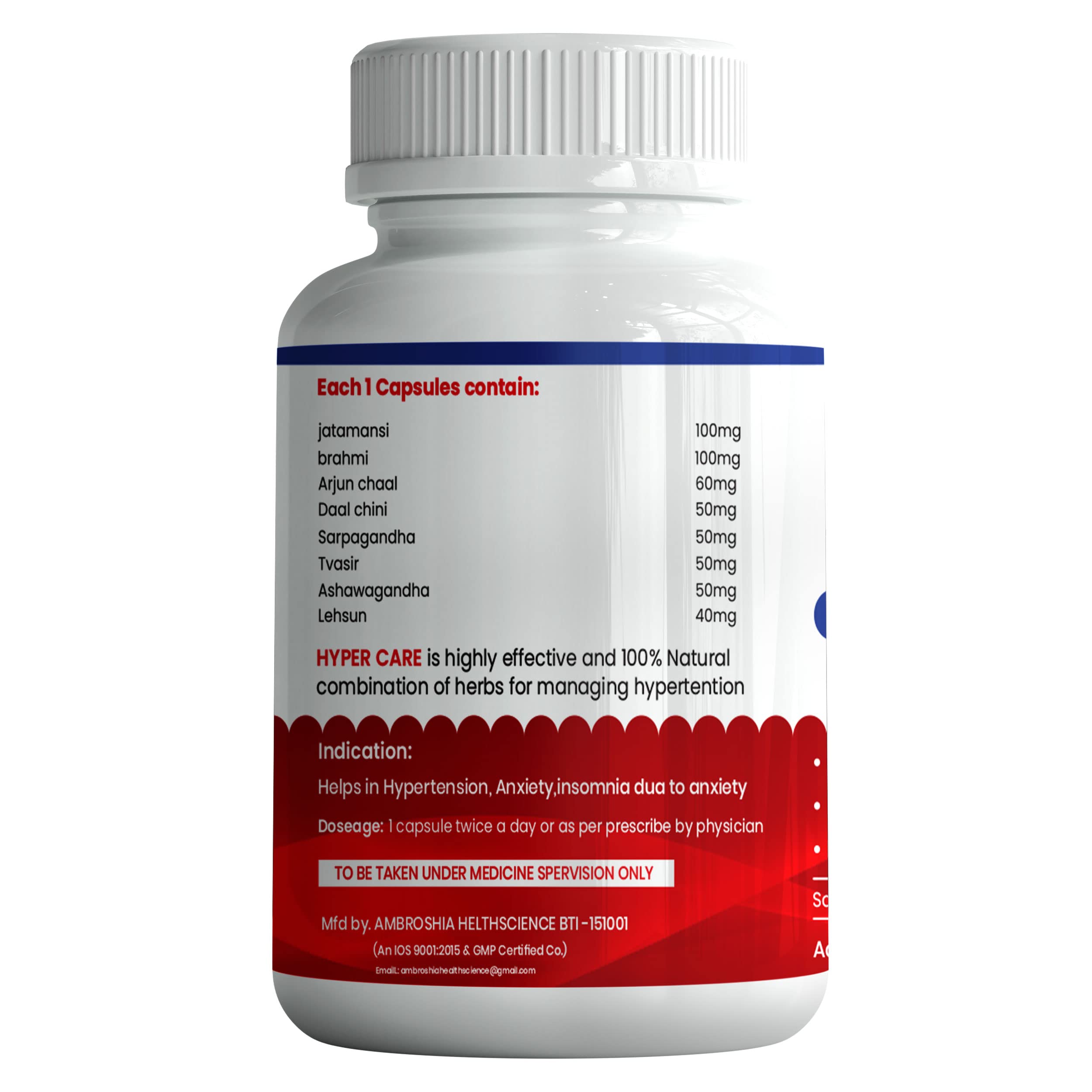 Hyper Care Caps.. for High BP Management SheopHyper Care Caps.. are herbal formulation that helps control and normalize it. This herbal tablet results from an Ayurvedic blend of some well-researched herbs mentioned in ancient Indian scriptures that possess natural properties to fight & its complications. So this herbal tablet is so helpful in reducing levels and keeg high BP complications at bay. It is formulated using only pure herbal extracts; it's completely safe.