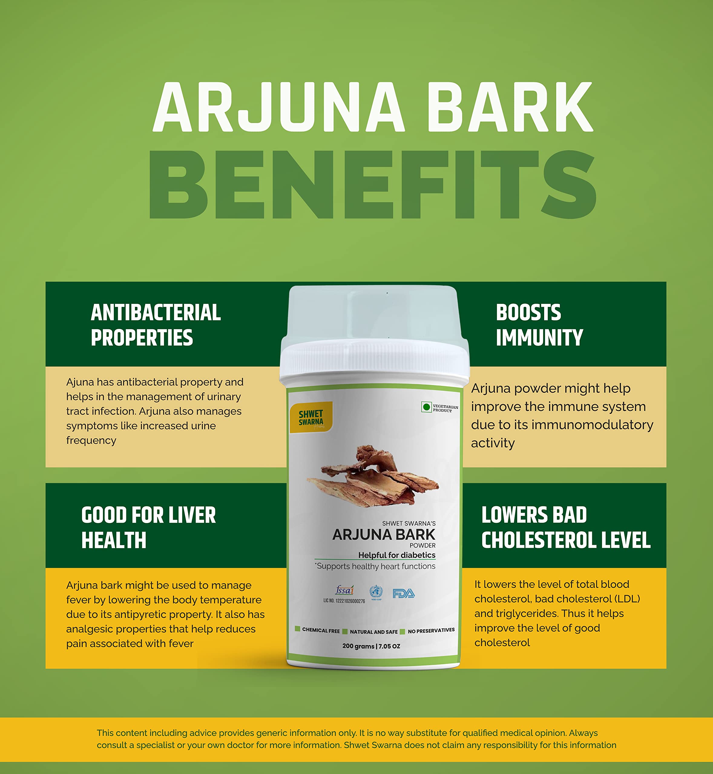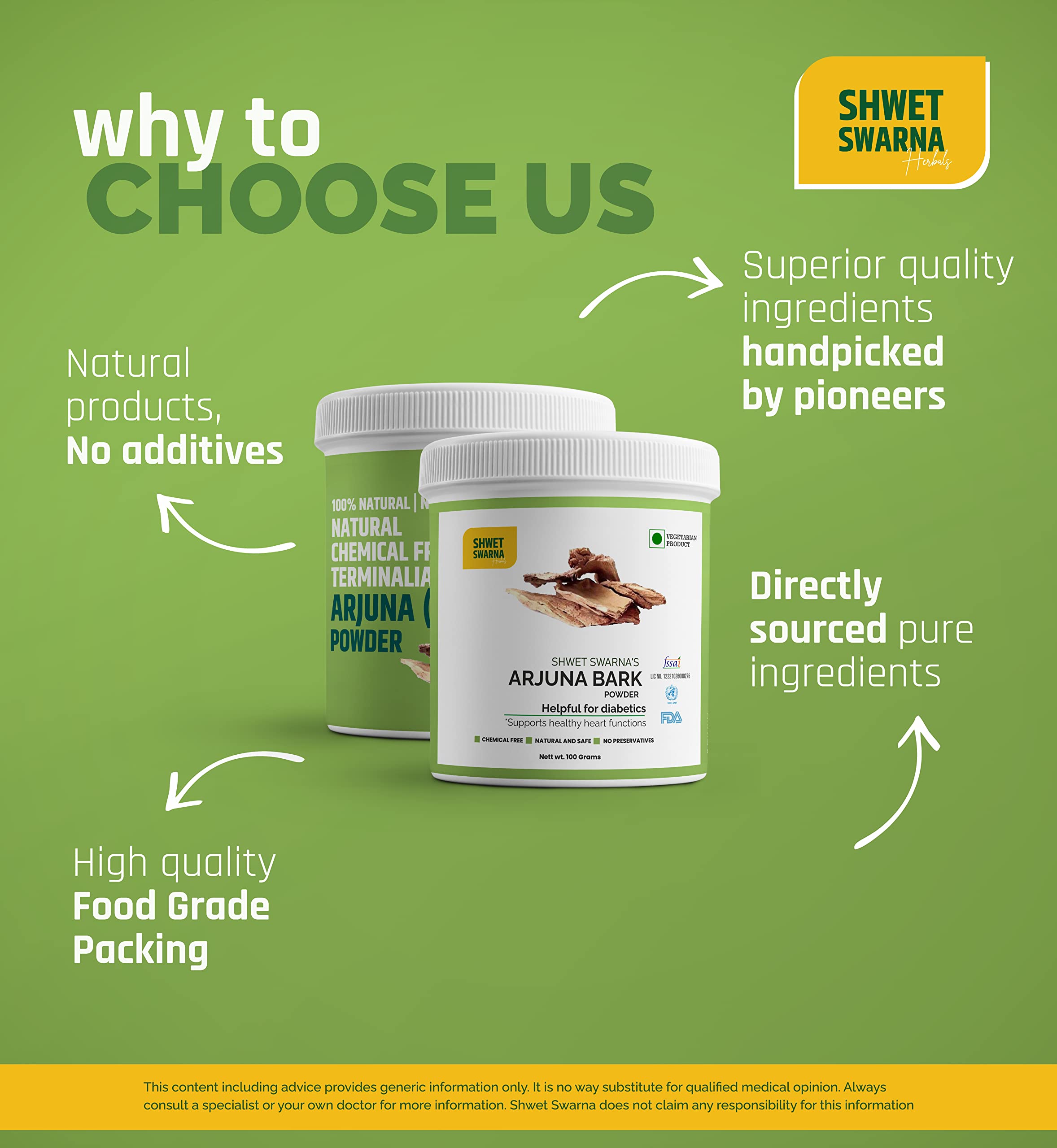 Arjuna scientific name; Terminalia arjuna belongs to the family of Combretaceae. Its bark decoction is being used in the Indian subcontinent for diabetes anginal pain hypertension based on the observations of ancient physicians for centuries. Arjuna contains the ingredients that help stimulate the heart. It might also help the heart by lowering cholesterol and blood pressure. 100% Natural & Organic ARJUNA (Terminalia Arjuna) Powder by Shwet Swarna FSSAI Certified 100 Grams Powder. Herbal Health Supplement is Helpful for Diabetics also supports Healthy Heart Functions.