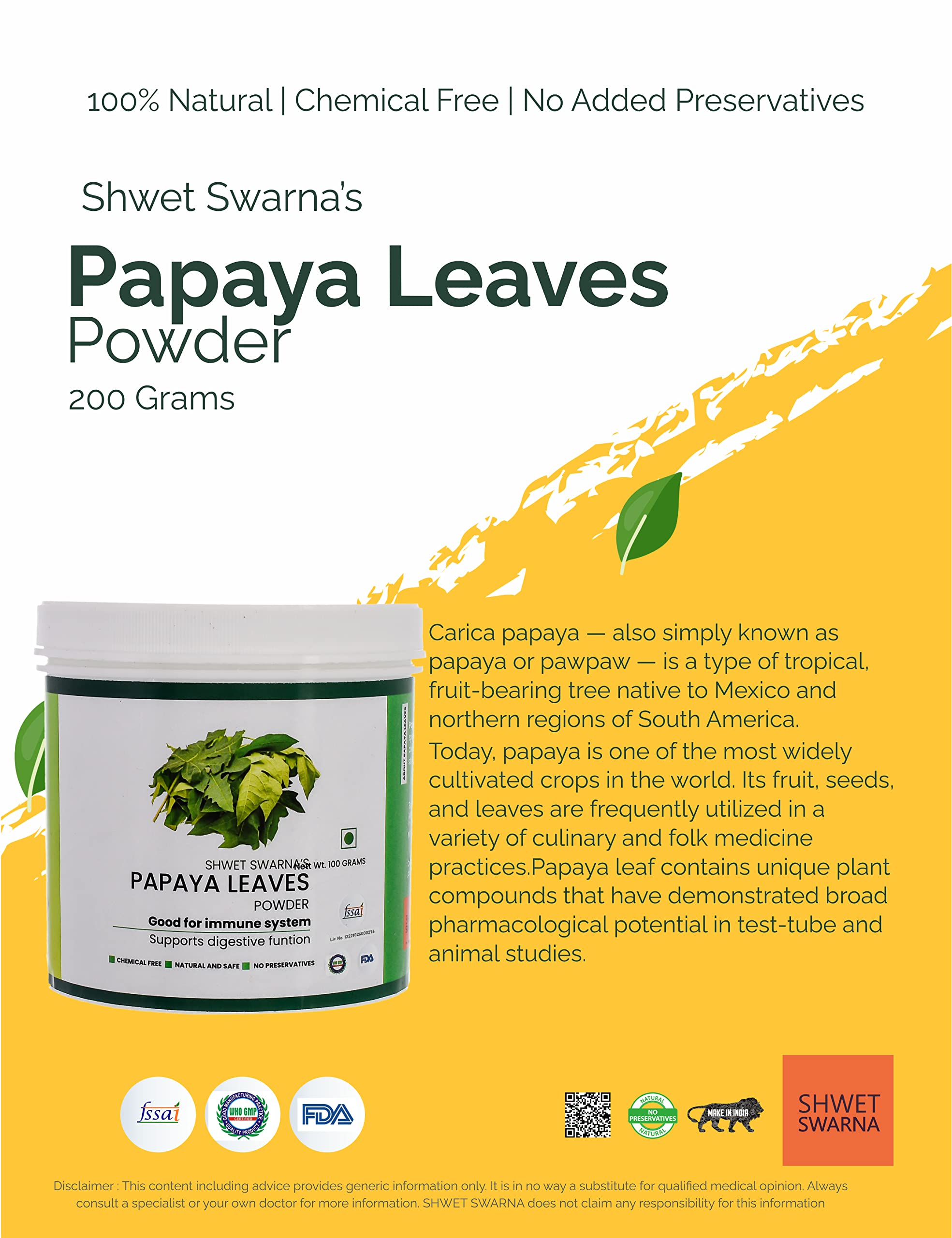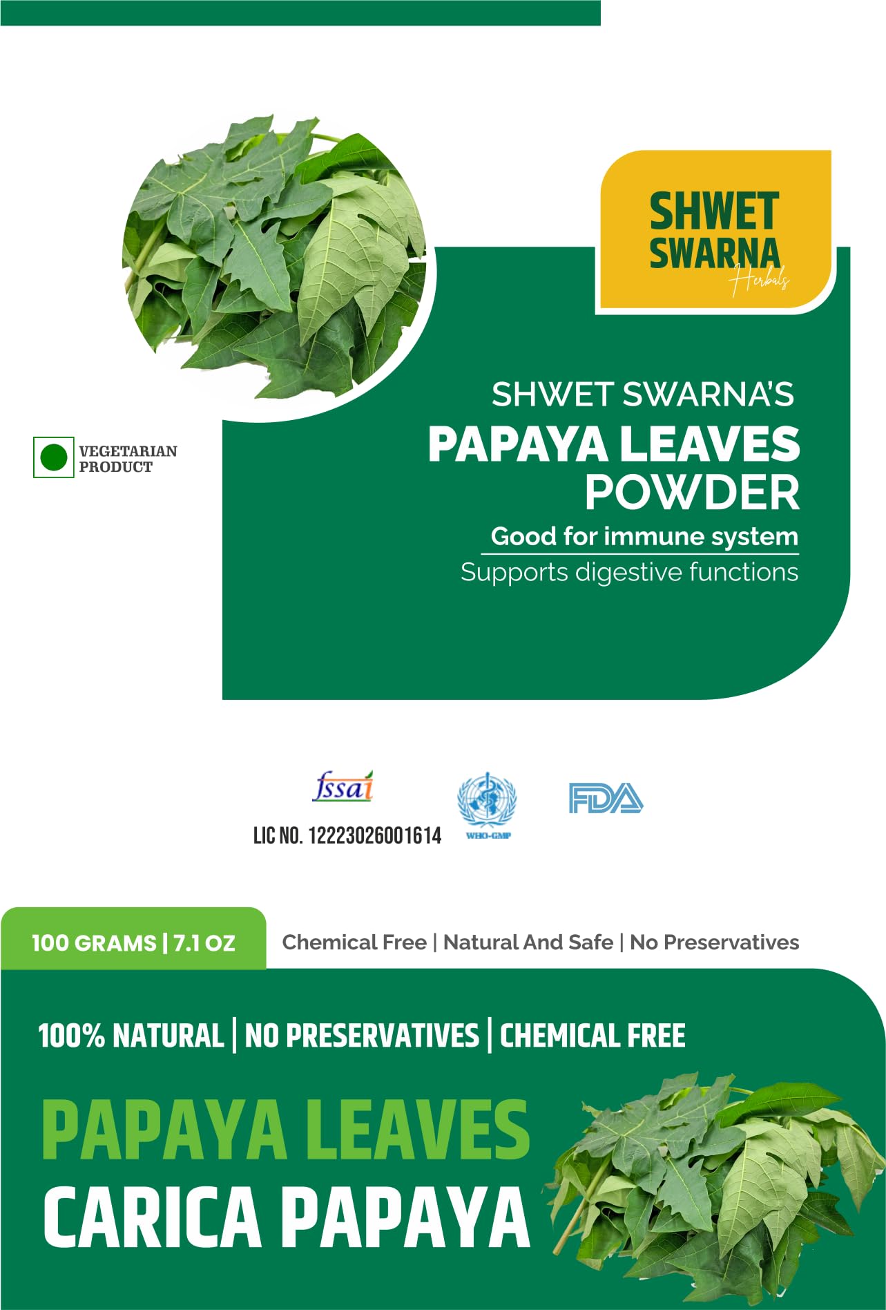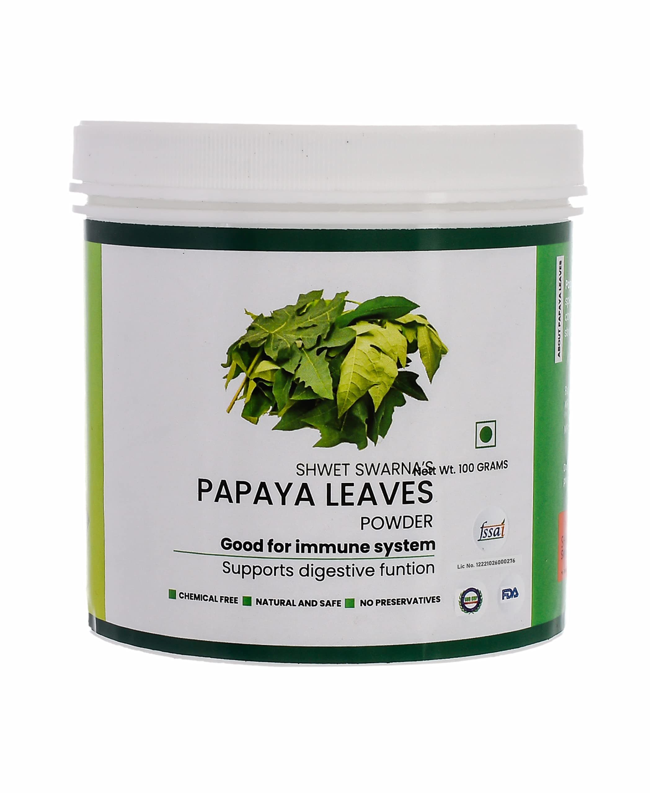 Shwet Swarna's 100% Natural & PAPAYA LEAVES (Carica Papaya) Powder | Papita Boppayi Leaf | 100 Grams Powder.