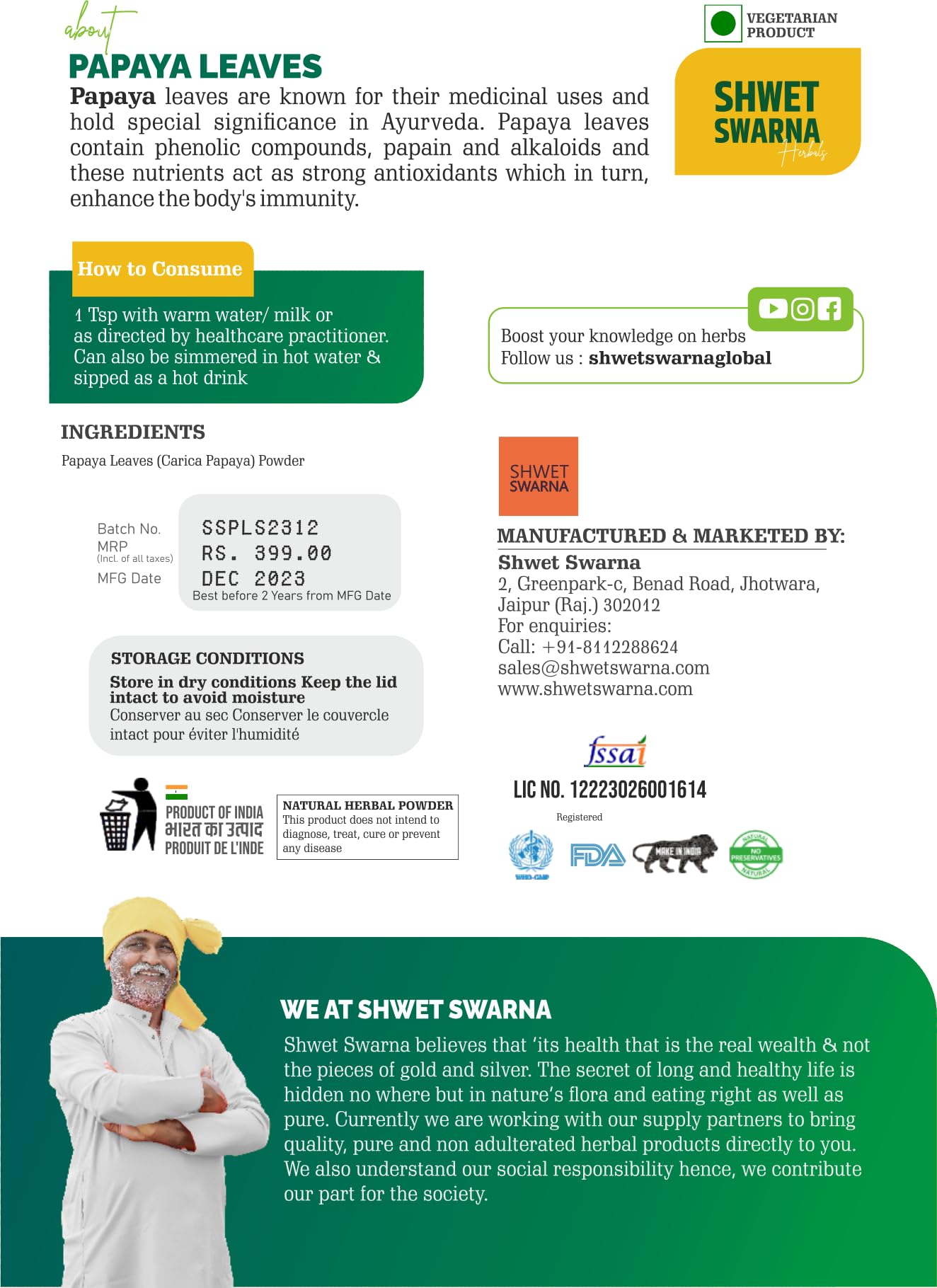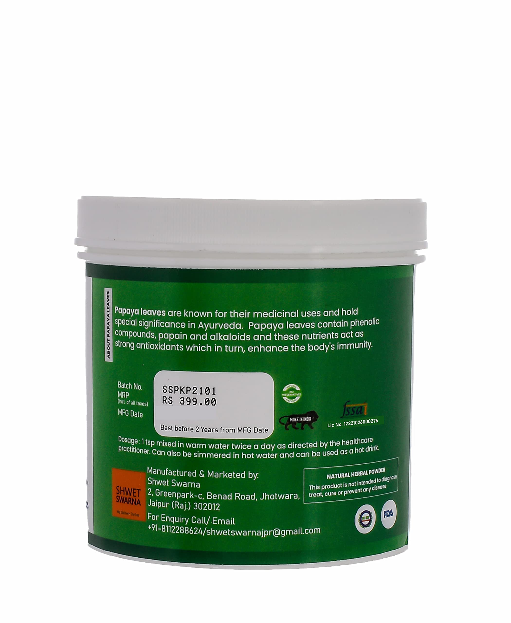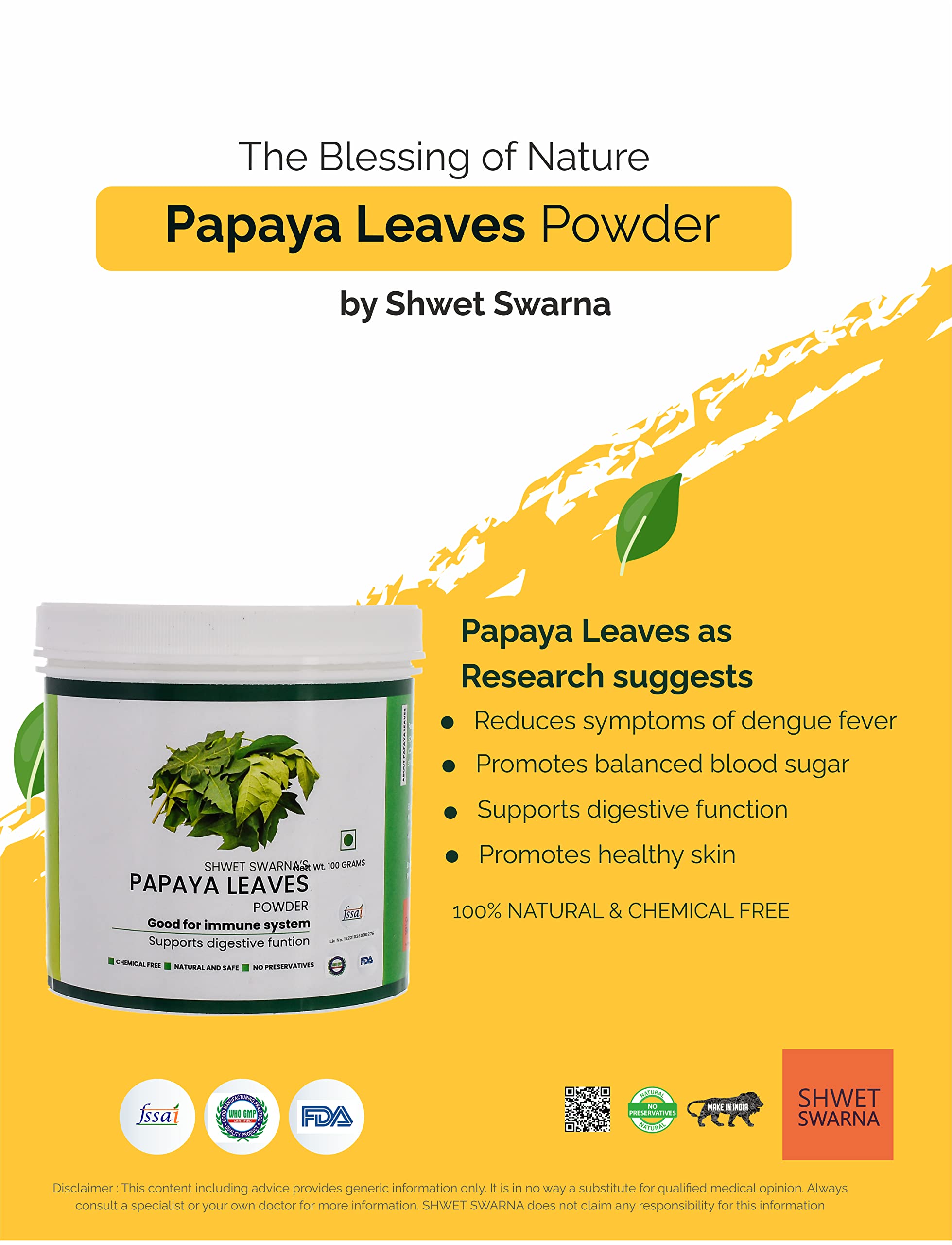 Shwet Swarna's 100% Natural & PAPAYA LEAVES (Carica Papaya) Powder | Papita Boppayi Leaf | 100 Grams Powder.