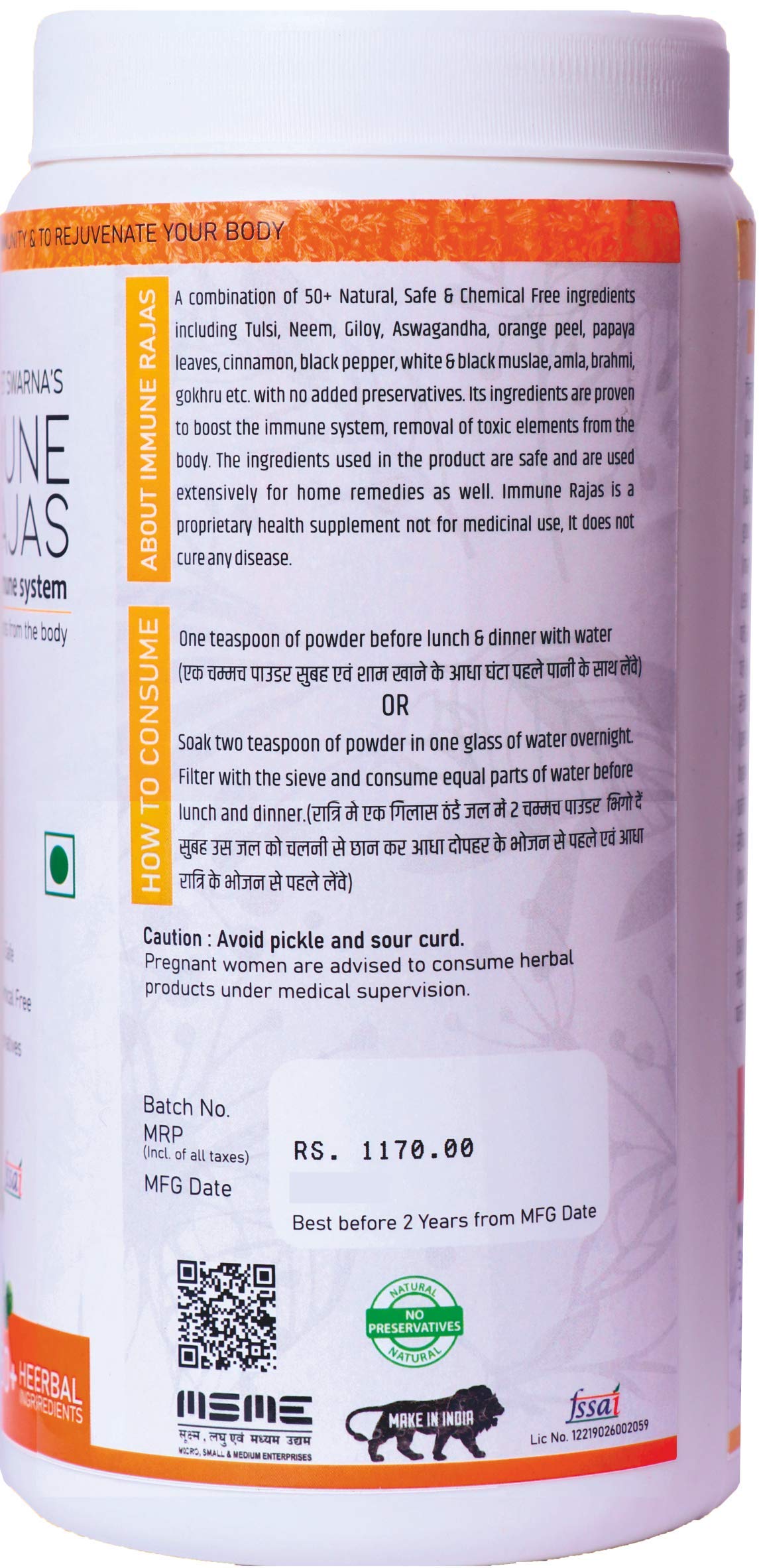 A combination of 50+ Natural Safe and Chemical free ingredients including Tulsi MoringaWhite Musli Black Musli Ashwagandha Giloy Mulethi Arjunchaal Gokhru Dalchini Kali Mirch Gokhru Amla Brahmi Gokhru etc. with no added preservatives Its ingredients are proven to boost the immune system removal of toxic elemets. The ingredients used in the product are safe and are used extensively for home remedies as well. Immune Rajas is a proprietary health supplement not for medicinal use and it does not cure any disease.