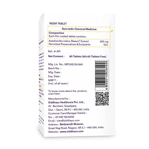 Siddhayu Neem Tablet (From the house of Baidyanath) | Natural Skin Support | Blood Purifier | Anti Acne and Pimples | (60 + 20 Tablets Free) - Pack of 2