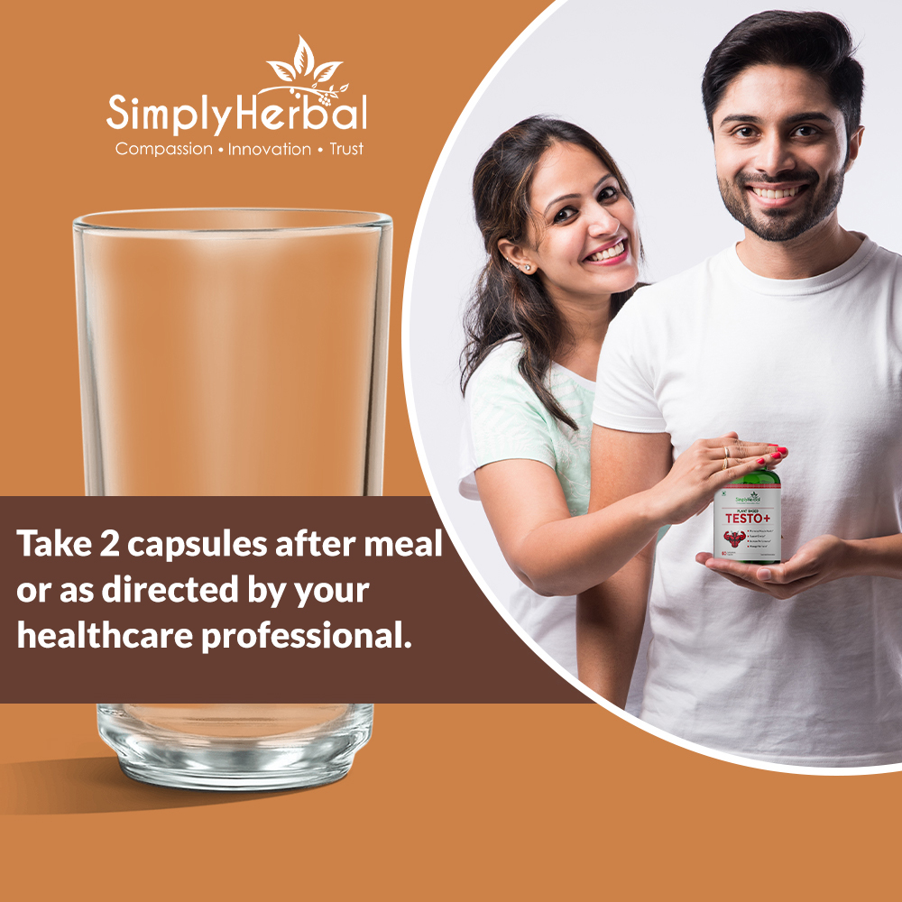 <b>BENEFITS OF SIMPLY HERBAL TESTO+ BOOSTER SUPPLEMENT</b><br><br> ~ Boost Testosterone Levels<br> ~ Improves Performance & Stamina<br> ~ Increases Endurance<br> ~ Increases Muscle Strength<br><br> <b>IMPROVES BIOAVAILABILITY AND TOTAL TESTOSTERONE LEVELS</b><br> Increases Total and Bioavailable Free Testosterone levels, which assist to promote muscle growth, strength, and endurance. It also improves libido, sexual health, and overall well-being.<br><br> <b>DEVELOP STRENGTH AND MUSCLE</b><br> Testo+ are supplements that are designed to boost testosterone levels in the body, allowing you to gain muscle and strength more quickly. Testosterone boosters are typically taken in combination with a healthy diet and exercise regimen.<br><br> <b>BOOST YOUR STRENGTH AND STAMINA</b><br> Your ability to perform at your best throughout your most challenging workouts is enhanced by having more testosterone in your body. When it counts most, you'll be able to perform longer.<br><br> <b>STRESS MANAGEMENT FOR A JOYFUL MOOD</b><br> Essential vitamins and minerals along with Ashwagandha, Kaunch Beej, and Vidarikanda let your body beat environmental & physical stress.<br>