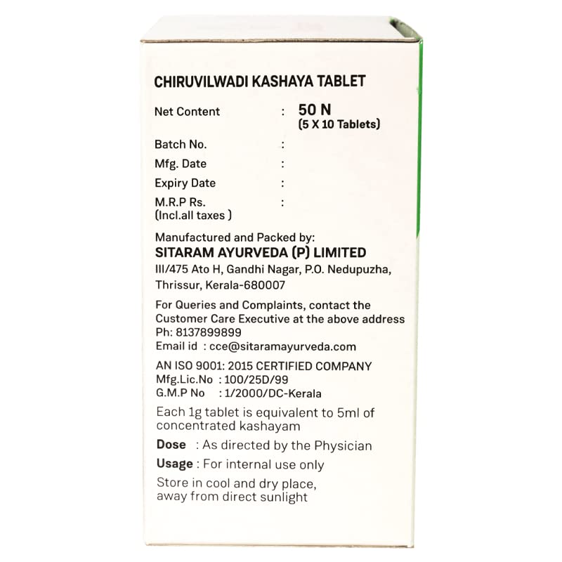 Chiruvilwa (Indian Elm) Chitraka (White wort) and Abhaya (Terminalia chebula) are potent ingredients of this Kashaya that revive and nurture the Jatharagni in the body. A competent fire or metabolic agency is central to the Ayurvedic concept of health. Chiruvilwadi kashayam is your simple way to get there. Kashaya or herbal decoctions harness the healing properties of herbs and roots in a mild and easily absorbable water base. The Tab. modification allows easy transportation and administration without compromising on its therapeutic benefits.