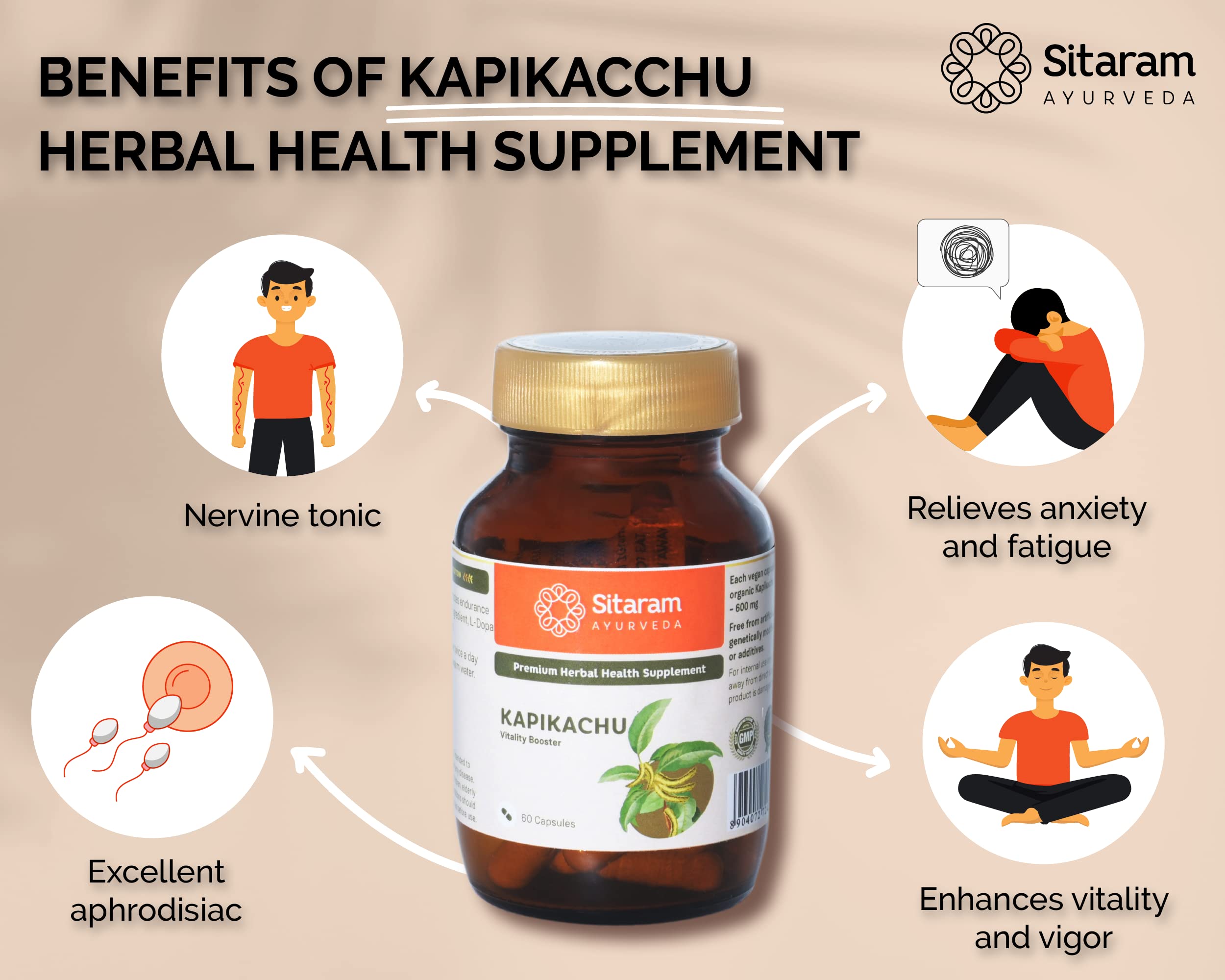 Sitaram Ayurveda Kapikachu Capsules 60 Nos | More Potent 600 MG Extract | Kerala Ayurvedic Kapikachhu Capsules | Naturally Boosts Dopamine Levels In The Body | Relieves Anxiety And Stress.