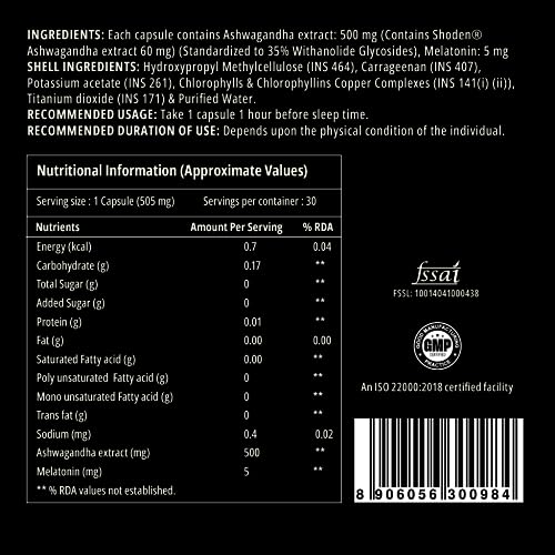 Sleep N' Rest helps to go asleep fast and get up refreshed. Each capsule contains 495 mg of Ashwagandha extract including 60 mg of Shoden (Bioactive Ashwagandha) extract & Melatonin 5 mg.