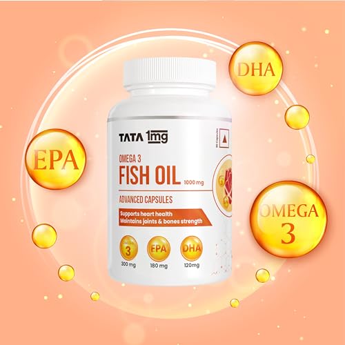Tata 1mg Omega 3 Fish Oil Capsule contains 1000 mg of fish oil which provides essential omega-3 fatty acids (180 mg of EPA and 120 mg of DHA). Omega 3 fatty acids may help reduce the risk of heart problems by regulating triglycerides and supporting joint and muscle functioning as well. Fish oil for cholesterol ensures they remain in check and helps maintain optimal cardiac functions. These fatty acids also support skin and eye health and brain and cognitive health.