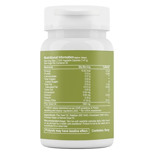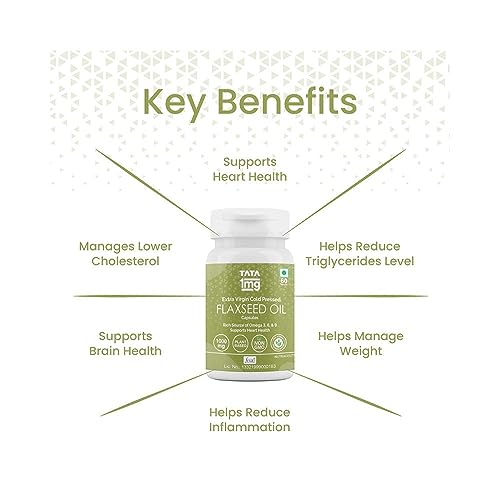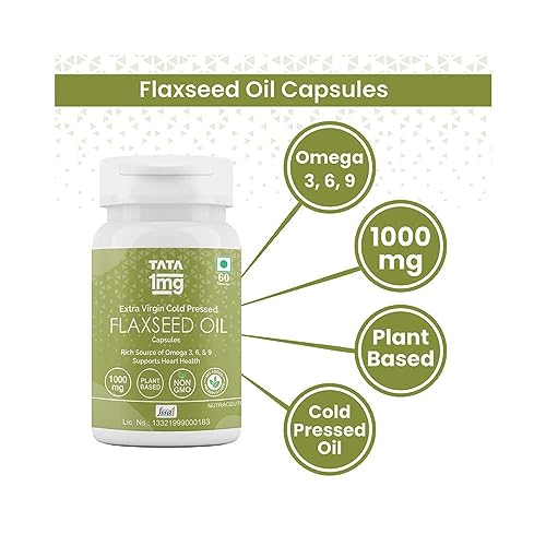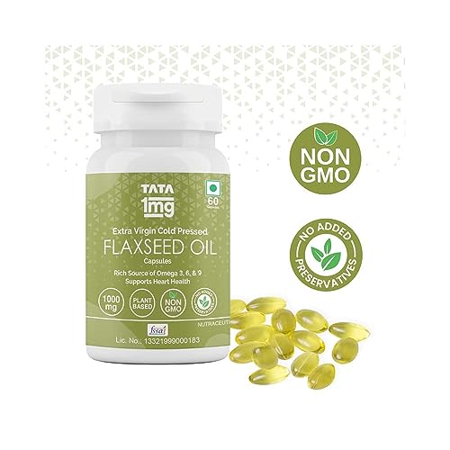 TATA 1mg Vegetarian Omega 3 Capsules 1000mg | Extra Virgin Cold Pressed Flaxseed Oil supplement with Omega 3, 6 & 9 | Veg Omega 3 capsules for healthy heart, brain & gut | Plant based | Pack of 60