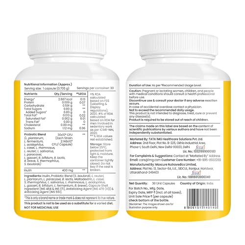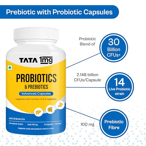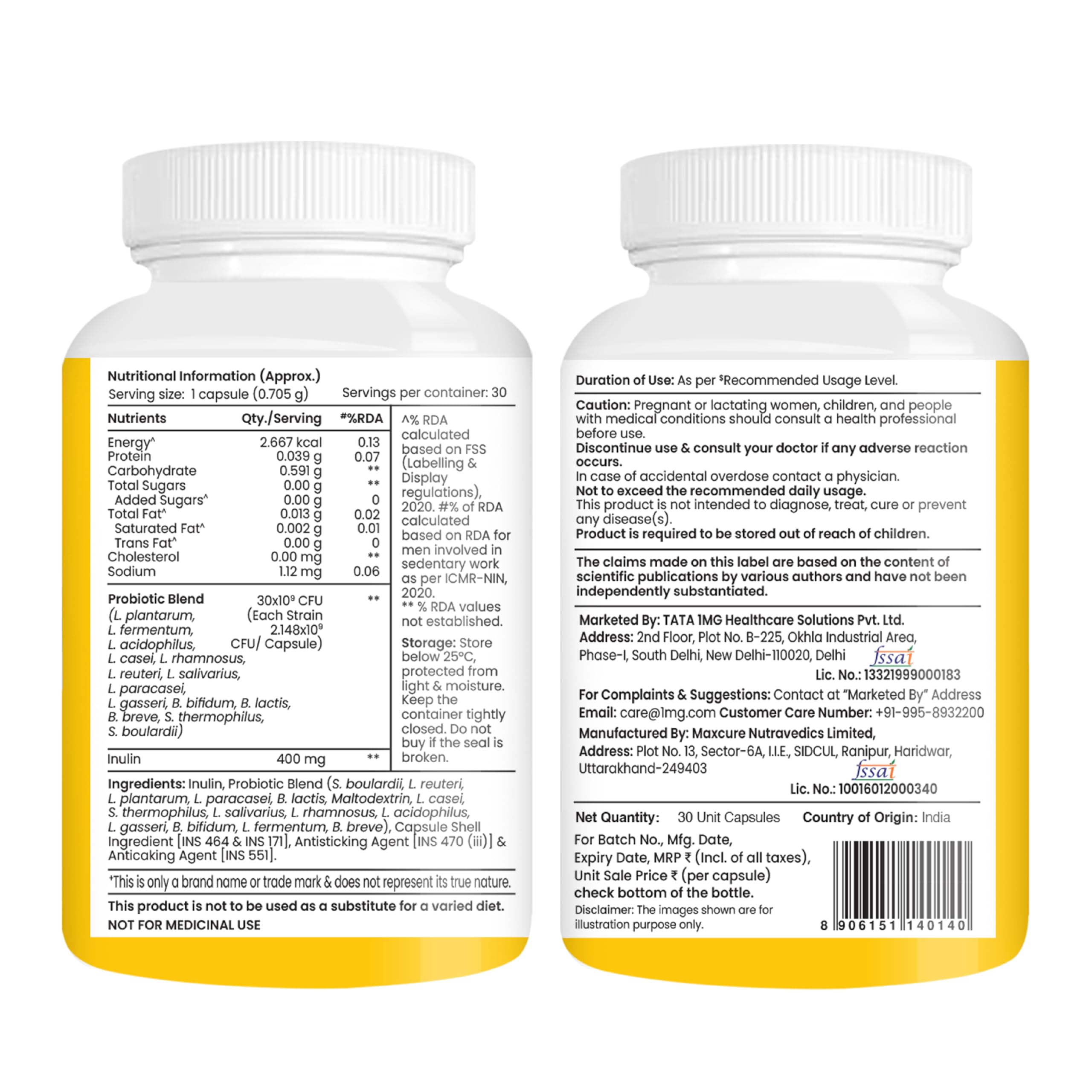 Tata 1mg Probiotics 30 Billion CFUs+ Capsule With Prebiotic Fibre Helps In Health Protection Level And Supports DigestionFor Unisex (Pack Of 30 Capsules)